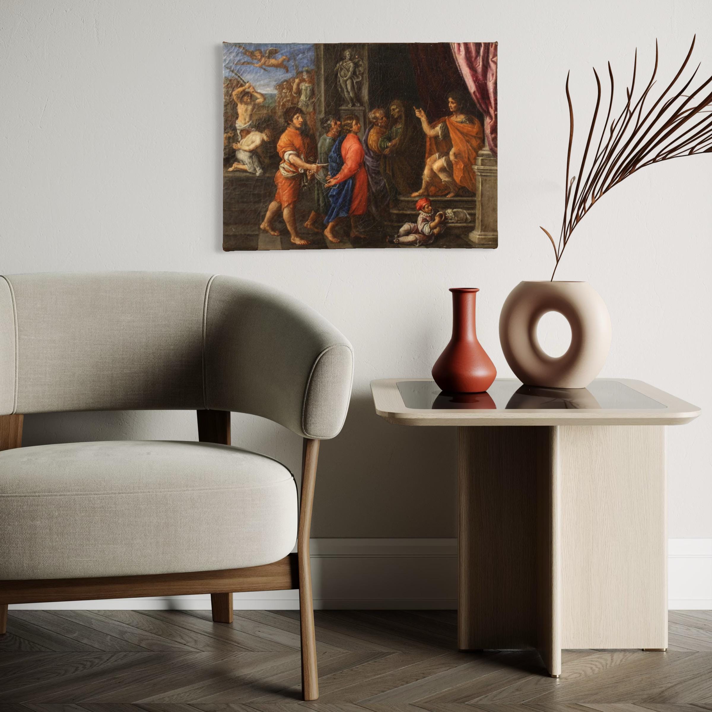 A refined 17th-century Italian painting. Oil on canvas artwork depicting the condemnation and martyrdom of the four crowned saints: Claudius, Nicostratus, Castorius, and Symphorian. According to tradition, the four were skilled stonemasons and refused to create pagan sculptures for the Emperor, professing their Christian faith. On the right, we see Emperor Diocletian pronouncing sentence, pointing to a classical statue of the god Apollo.