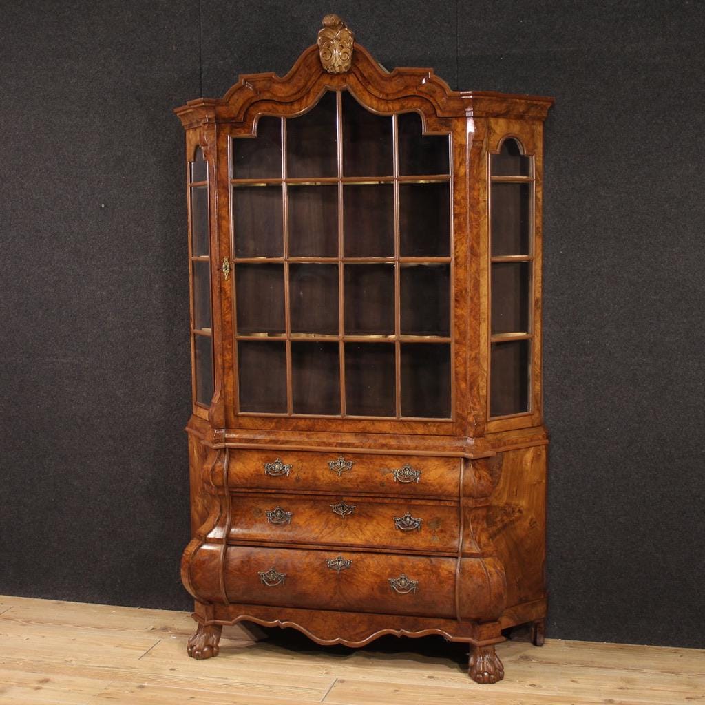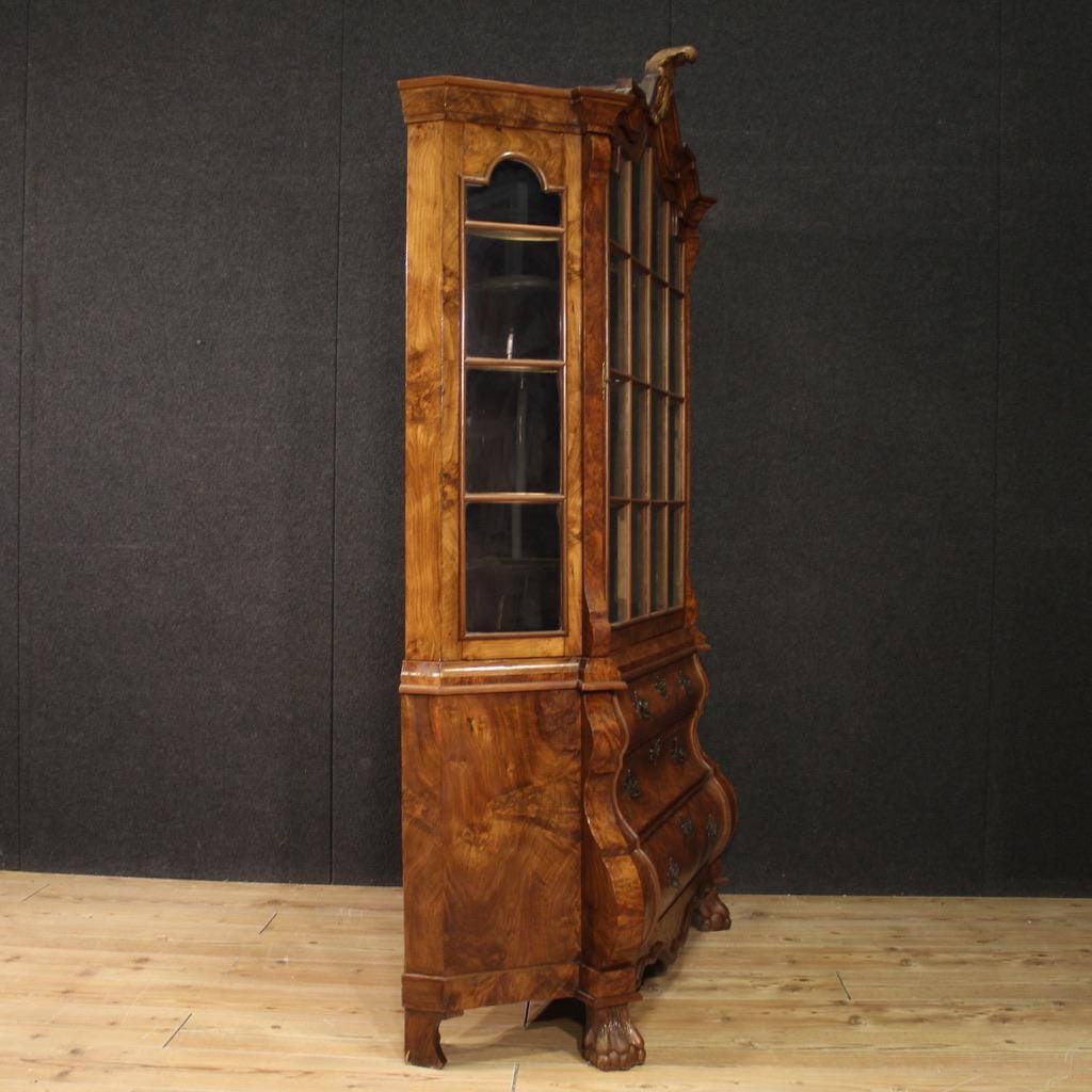 Dutch display cabinet from the mid-20th century. A beautifully crafted, curved front, walnut, burl, and beech veneer showcase, it features a beautiful design and attractive furnishings. The double-body display cabinet has three drawers at the bottom, while the upper body features a large door complete with a working key.