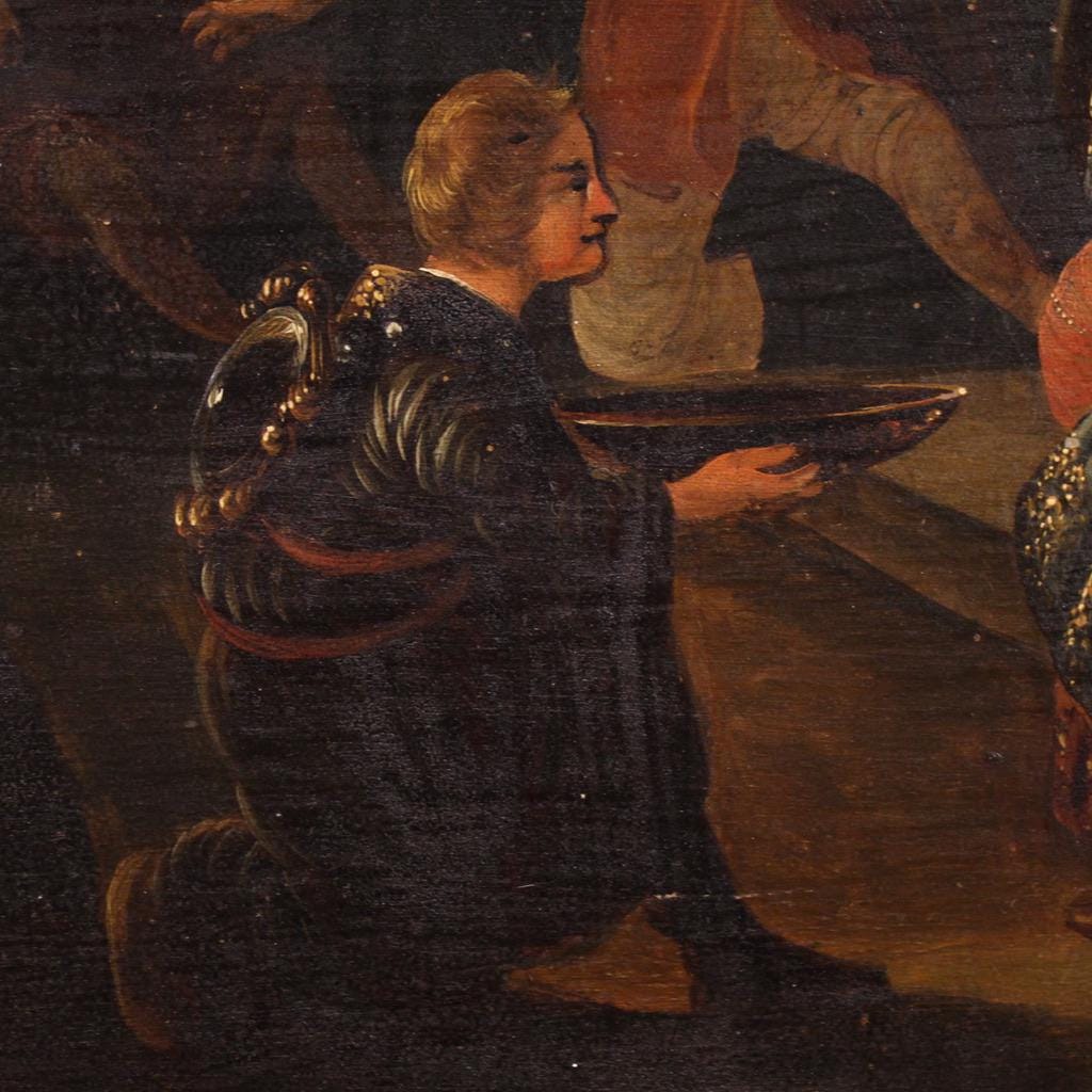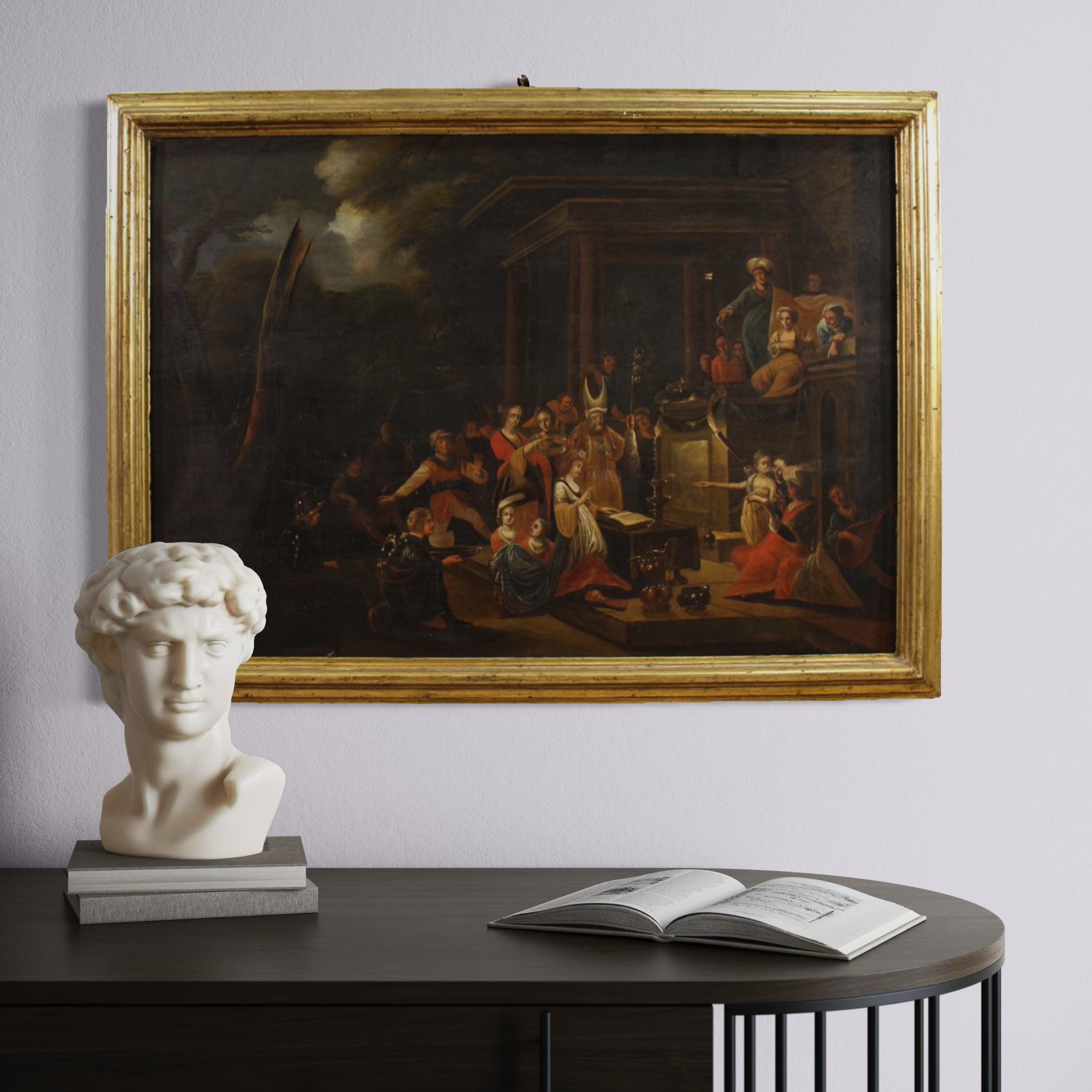 Antique 19th-century Flemish painting. Oil on panel artwork depicting a religious subject, The Dispute of Saint Catherine of Alexandria with the Philosopher, of moderate pictorial quality. A beautifully sized and attractive panel adorned with a carved and gilded wooden frame. The artwork unfolds horizontally, with numerous figures and details that enhance the scene.