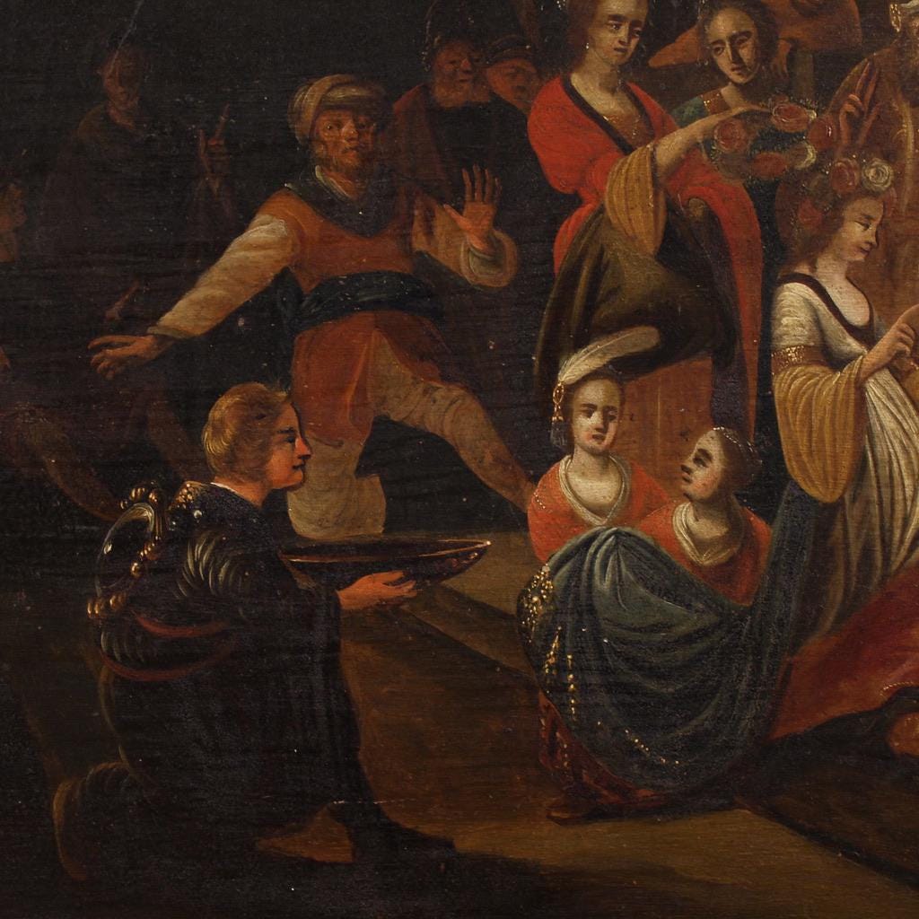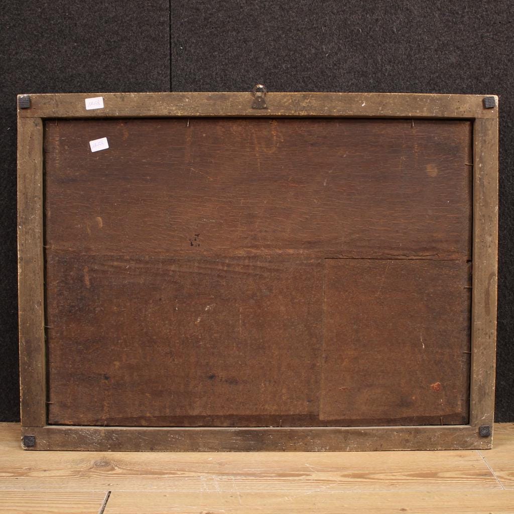 At the center is the saint, her head adorned with a floral garland, engaged in a discussion with the court scholars. In the background is a wooded landscape and classical-style architecture (see photo). The painting has undergone light restoration with small patches of color. The painting is in good condition. Interior dimensions: H 57.5 x W 81 cm.