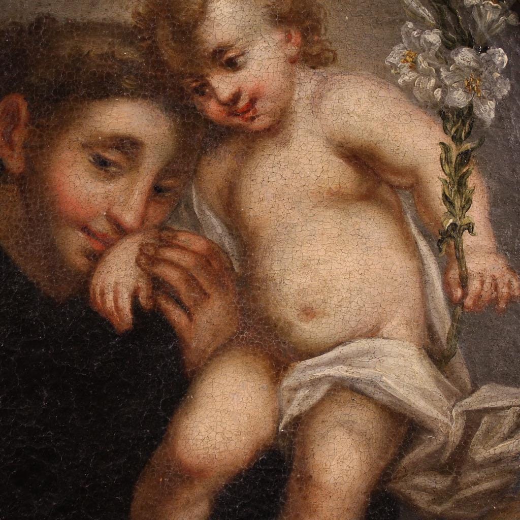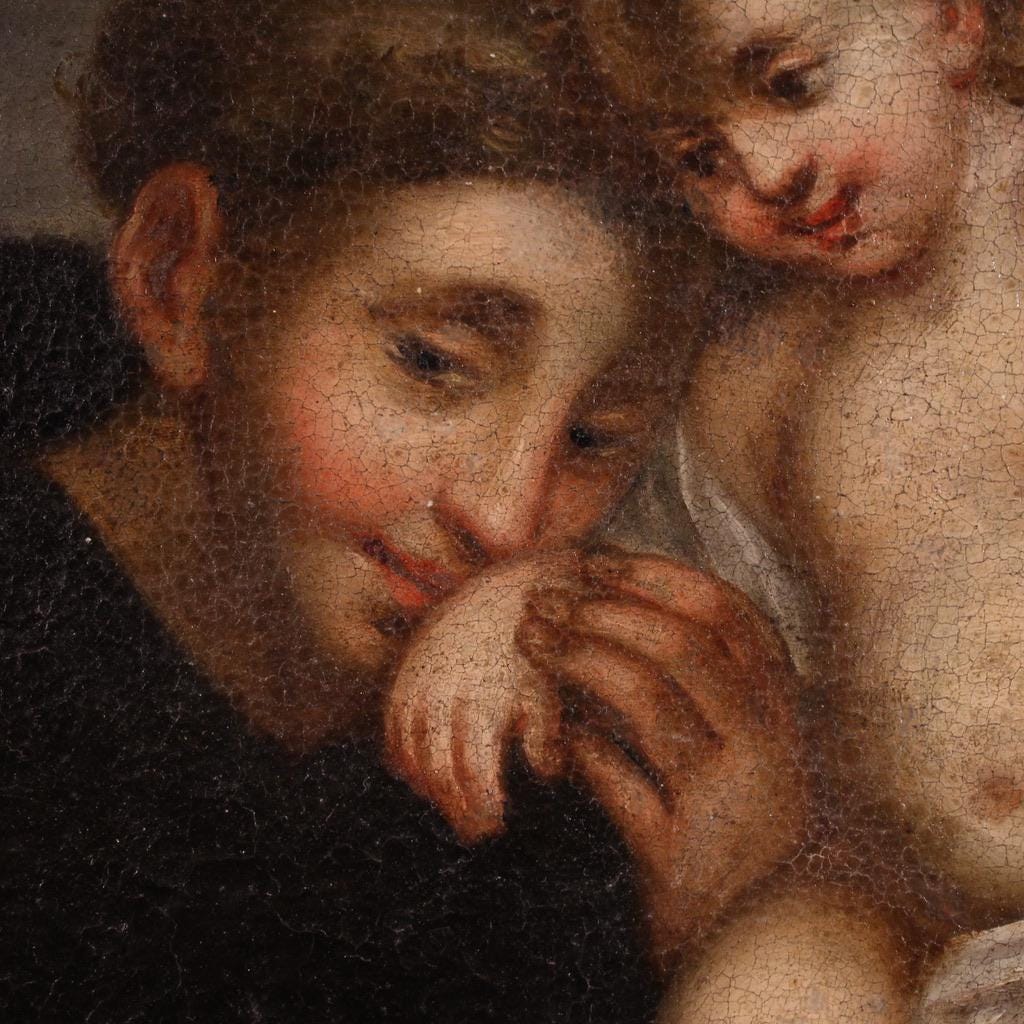Antique 18th-century Italian painting. Oil on canvas, first canvas, artwork depicting a religious subject, Saint Anthony of Padua with the baby Jesus, with good pictorial quality. An oval painting adorned with a non-contemporary 20th-century carved and gilded frame, beautifully decorated. The artwork depicts the baby Jesus standing on a table with a lily in his left hand (see photo).