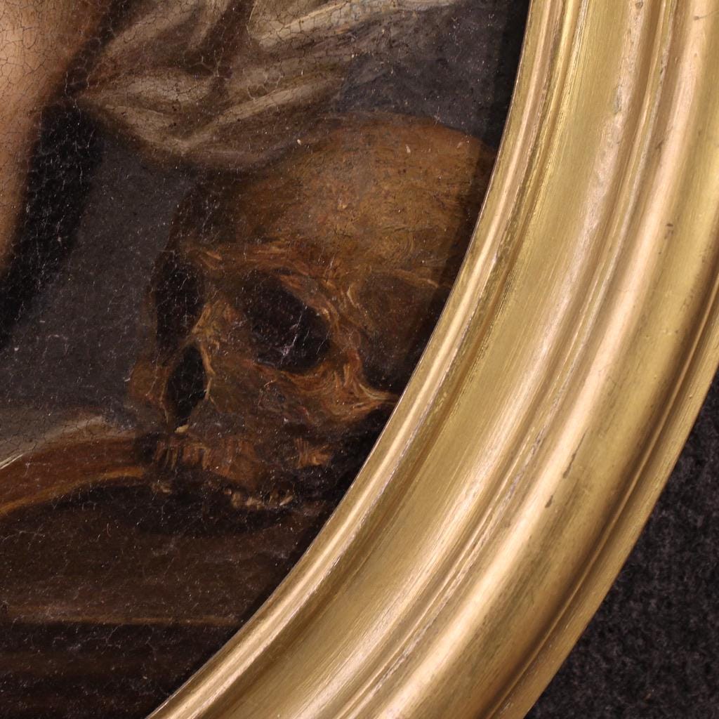 The details of the book and the skull at Jesus' feet are pleasing. The painting has undergone conservative restoration, with small areas of color restoration, a replacement of the stretcher, and a small patch on the back (see photo). This artwork has a beautiful patina, suitable for antique dealers and collectors, and is in good condition. Internal dimensions: H 53 x W 43 cm.
