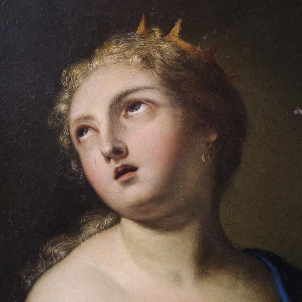 The queen is portrayed in a moment of suspension, when life has not yet been abandoned, regal even in death and mistress of her own destiny. The flowers on the table reiterate the theme of vanitas—beauty, power, and glory are always destined to fade. This artwork can be attributed to the great Italian painter Francesco Trevisani (1656-1746). The figure, idealized and imbued with a composed melancholy, embodies the master's lyrical language.
