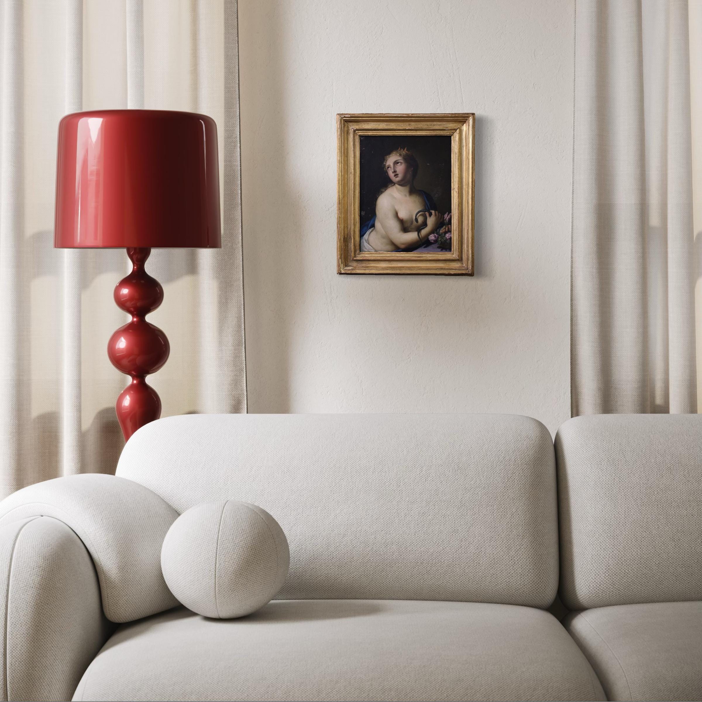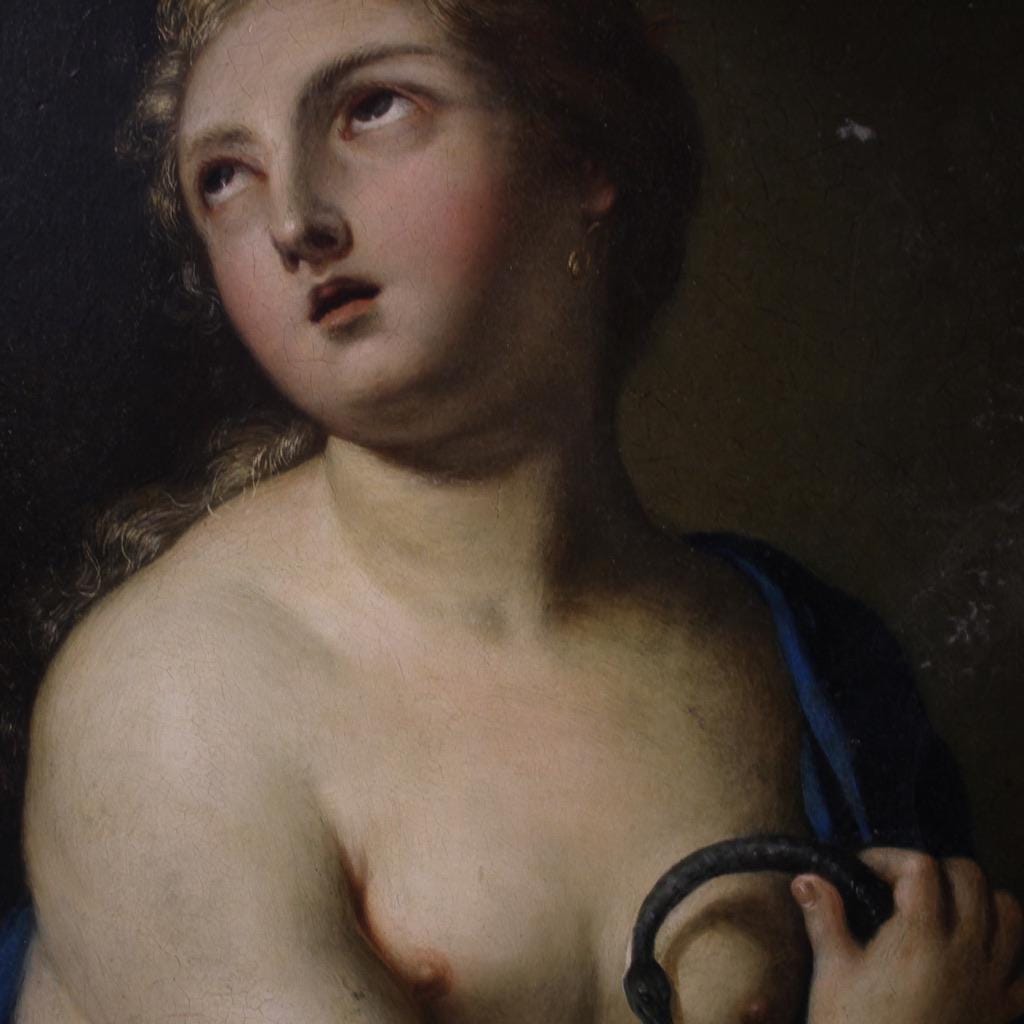 A magnificent Italian painting from the first half of the 18th century. This painting oil on copper depicts the intense death of Cleopatra, an artwork of extraordinary pictorial quality. The last queen of Egypt, she was one of the most powerful and tragic figures of antiquity. After the defeat of Anthony, Cleopatra chose death rather than be exhibited as a trophy in Rome. Tradition holds that she took her own life by being bitten by a snake, and the artist captures the inner moment of her decision.