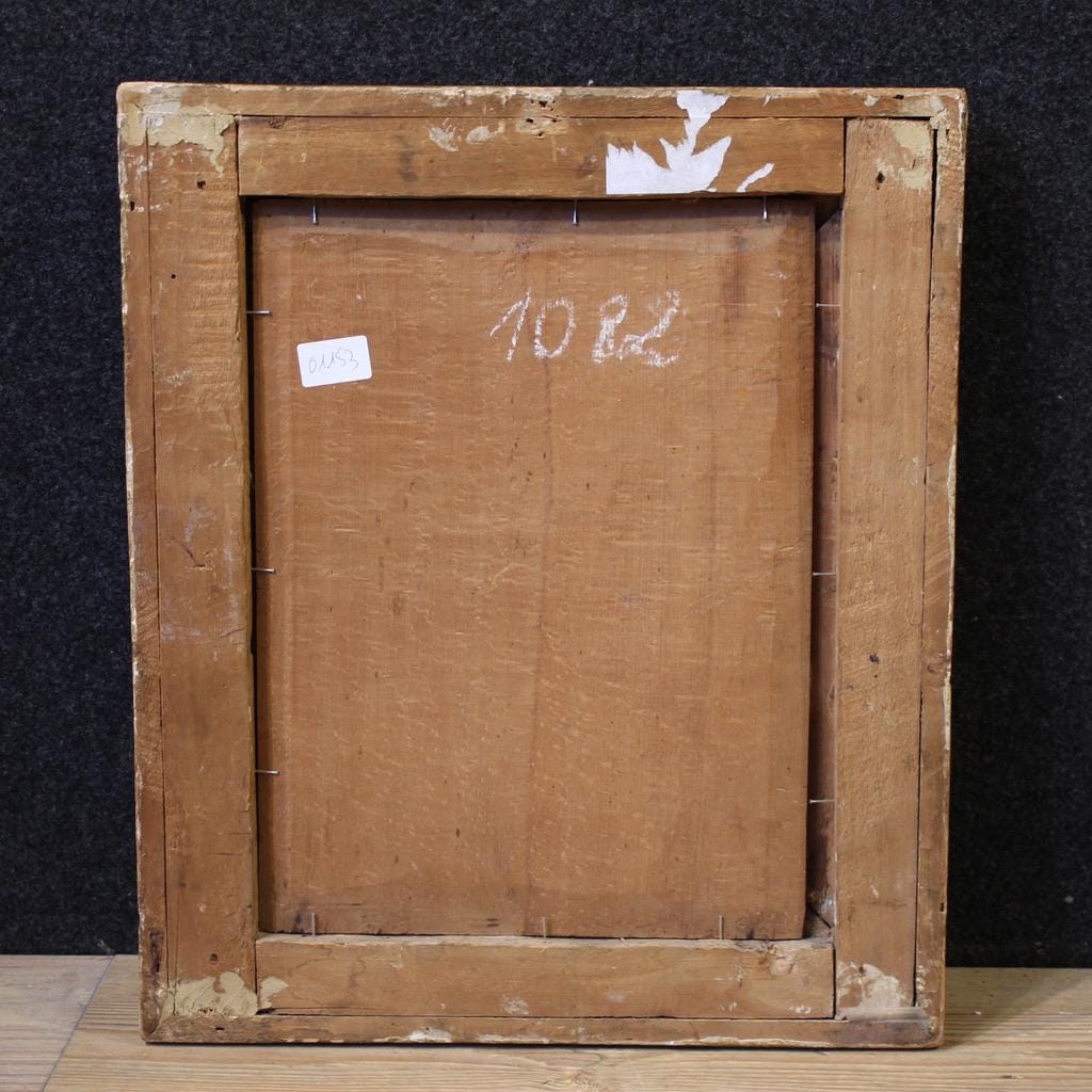 An ideal painting for prestigious spaces, whether classic or modern, perfect for a library or professional studio. The 20th-century frame is carved and gilded wood, beautifully decorated, with some signs of aging. The painting has already been restored, with small areas of color restoration, but is in overall good condition. Internal dimensions: H 33 x W 26 cm.