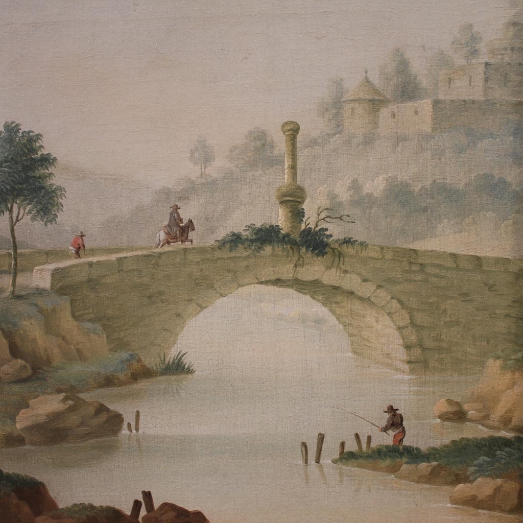 Meanwhile, a fisherman can be seen on the riverbank, while on the bridge, travelers on foot and on horseback prepare to cross. The composition is balanced and airy, constructed along a diagonal that draws the eye to the open landscape in the background, where a fortified village can be glimpsed. The sky occupies a significant portion of the canvas, and thanks to the aerial perspective technique, the scene gains surprising depth. The palette is clear and harmonious, with soft greens, warm ochres, and milky blues, while the light is diffused, creating a serene atmosphere.