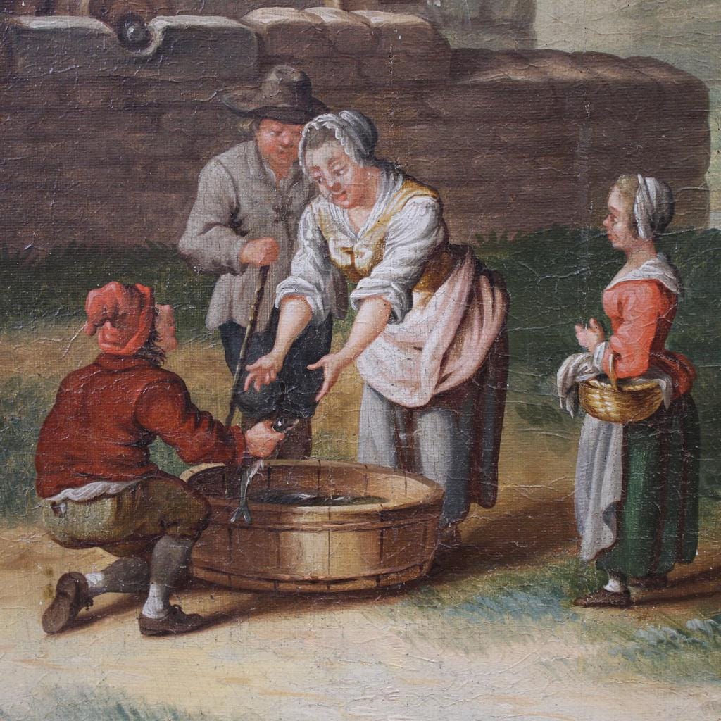 Antique 18th-century Italian painting. Oil on canvas, first canvas, artwork depicting a rural genre scene set in an idealized countryside landscape. The composition's focal point is the large watermill located along the river. The scene is enlivened by several figures in the foreground: two women and a man, dressed in peasant clothing, approach a fishmonger.