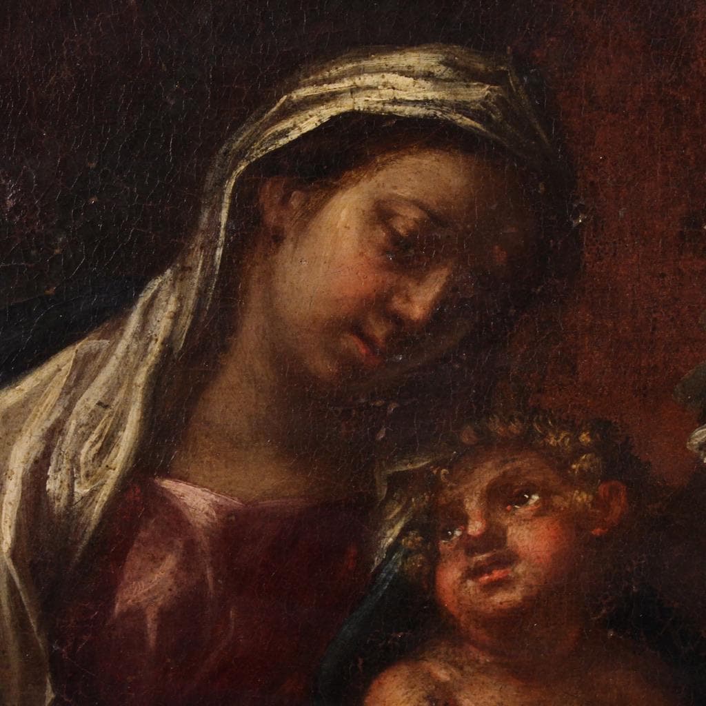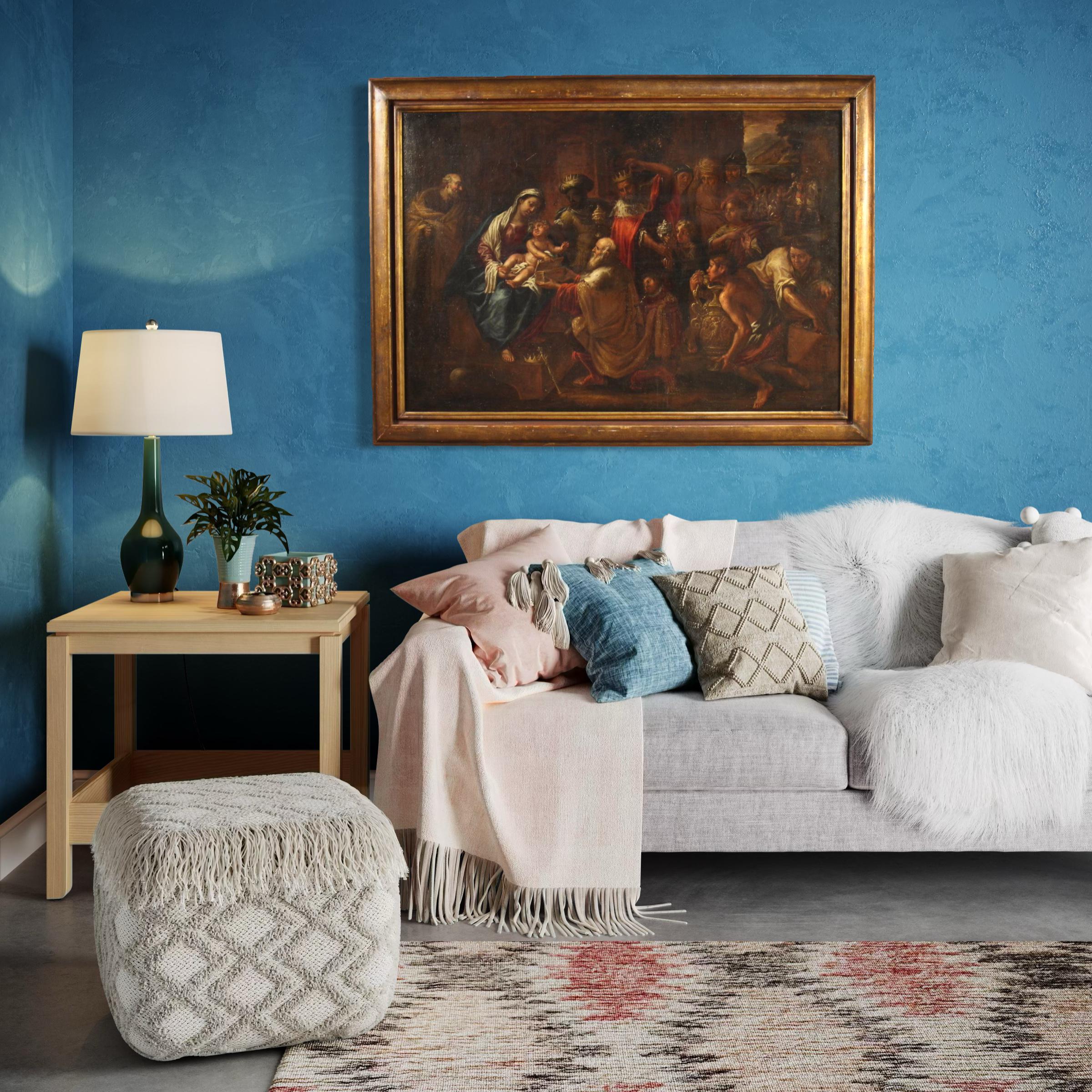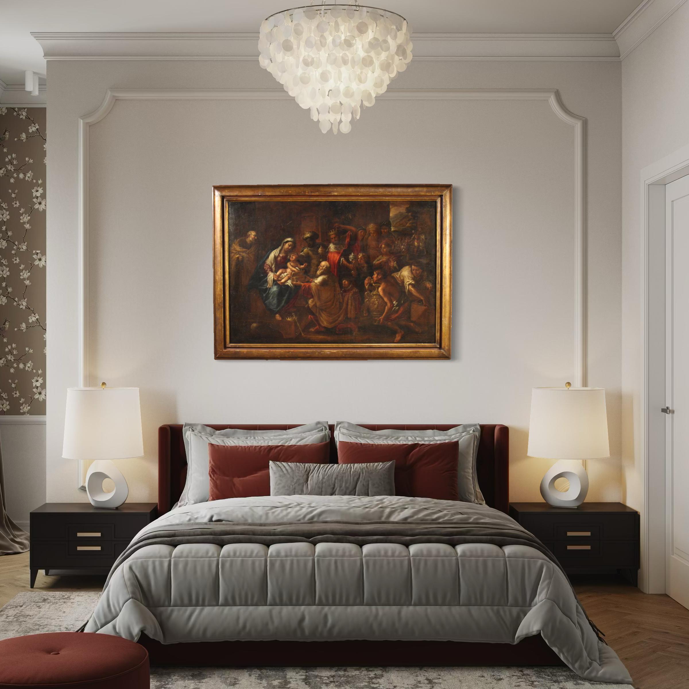 Genoese school, mid-17th century. Oil on canvas artwork depicting a captivating religious subject: the Adoration of the Magi. The composition is rich, theatrical, and strongly narrative. The painting is set in a dimly lit interior, illuminated by a warm light that focuses on the protagonists. The Madonna, seated and wrapped in a splendid blue cloak with a pinkish tunic, holds the naked child, rendered with fleshy softness and childlike naturalness.