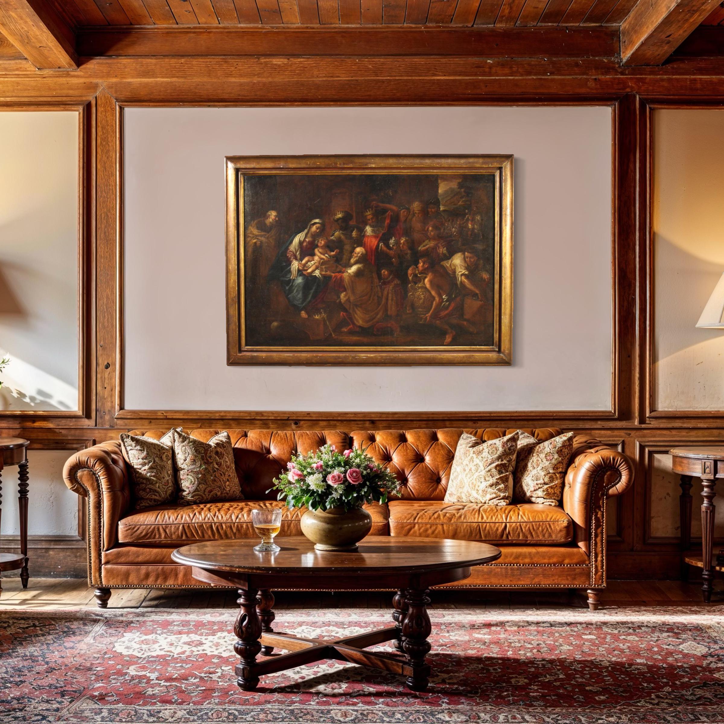 The shadows are warm and brown, interacting with a palette dominated by deep reds and golden ochres, creating a serene and solemn atmosphere. A painting capable of combining historical value, narrative force, and scenic presence, perfect for collectors with a taste for Baroque sacred painting. Ideal for refined, traditional or contemporary settings, this painting can be paired with both classic and eclectic furnishings.