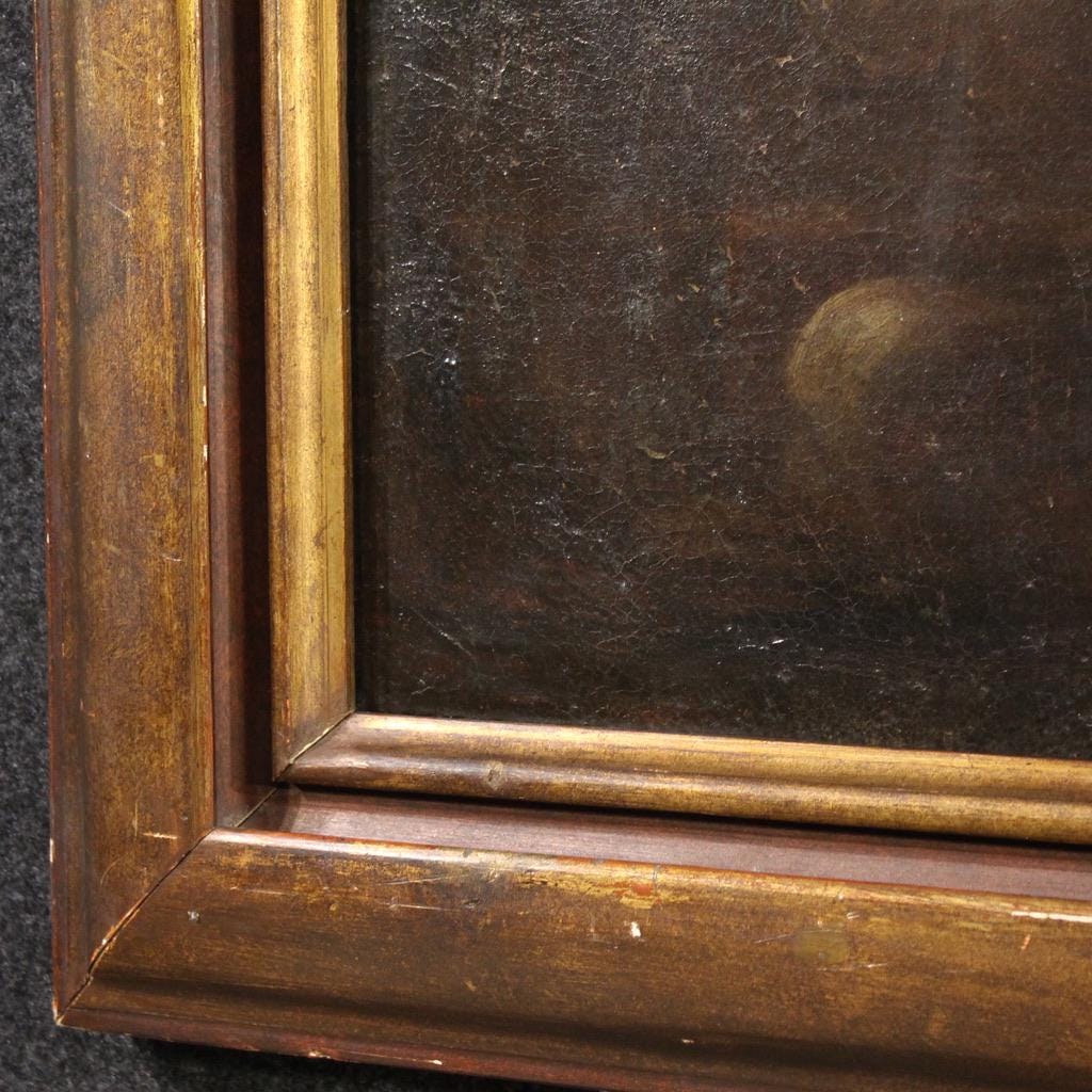 Large 20th-century carved and gilded wood frame, beautifully decorated, with some signs of aging. The painting has already been restored with re-lining, replacement of the stretcher, and restoration of color in small areas, but is in overall good condition. Internal dimensions: H 85 x W 125 cm.