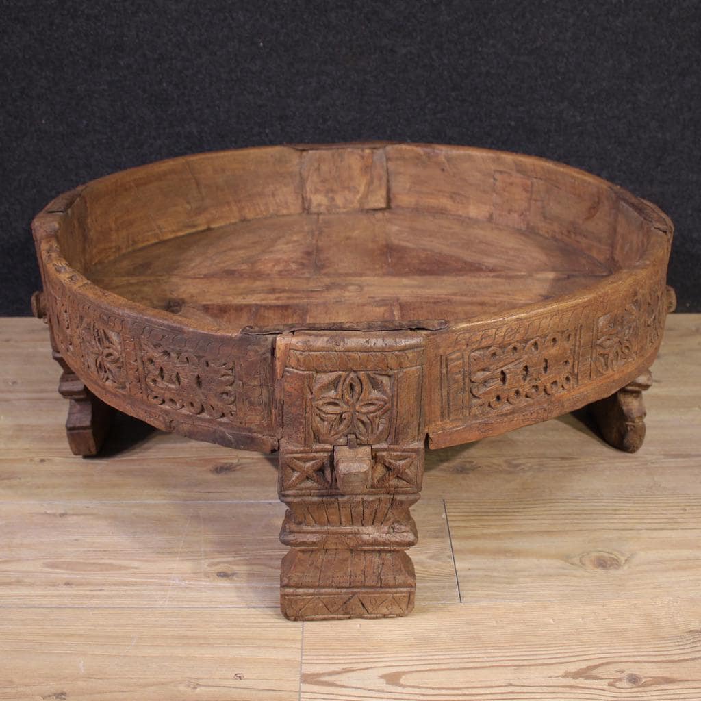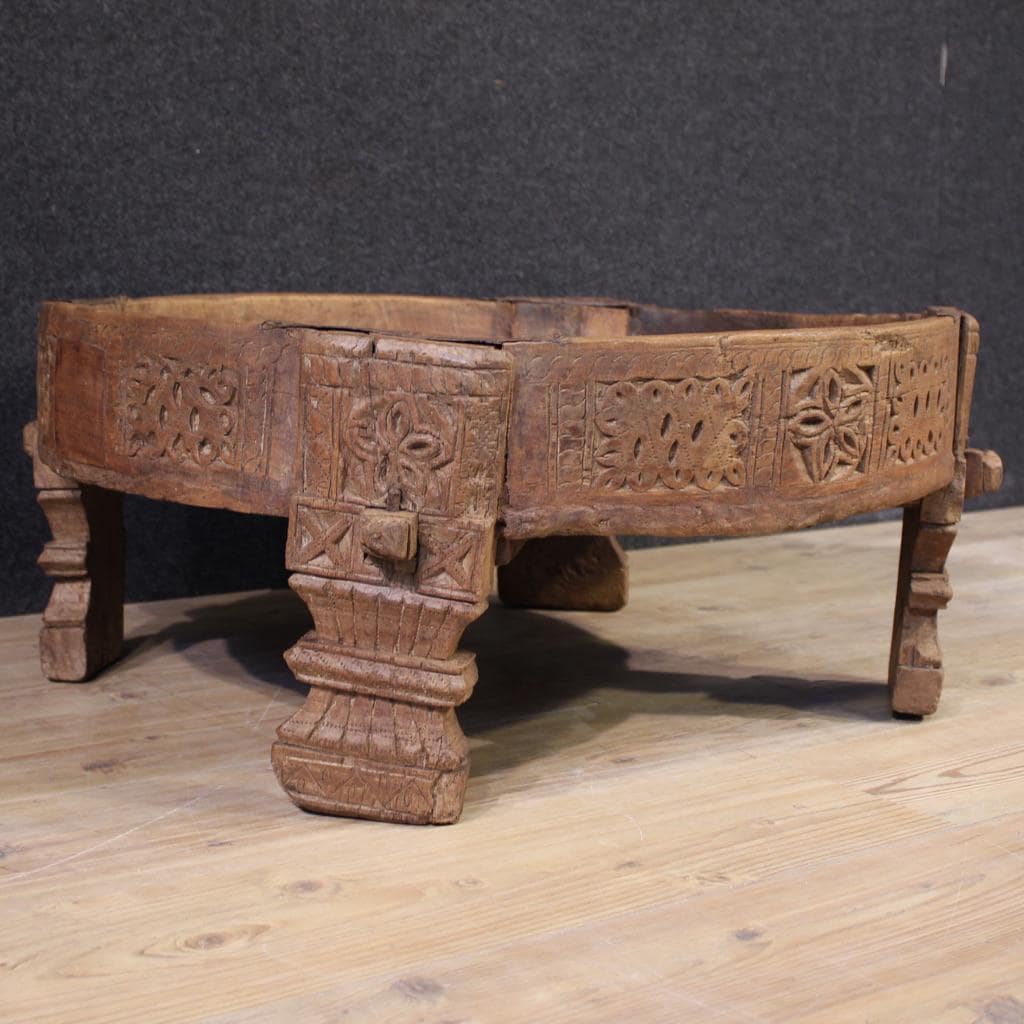 Indian coffee table from the first half of the 20th century. Richly carved and chiseled in exotic wood, this attractive piece of furniture is a delight to behold. The table's hollowed-out top offers generous storage space. It rests on four solid, finely chiseled wooden legs.