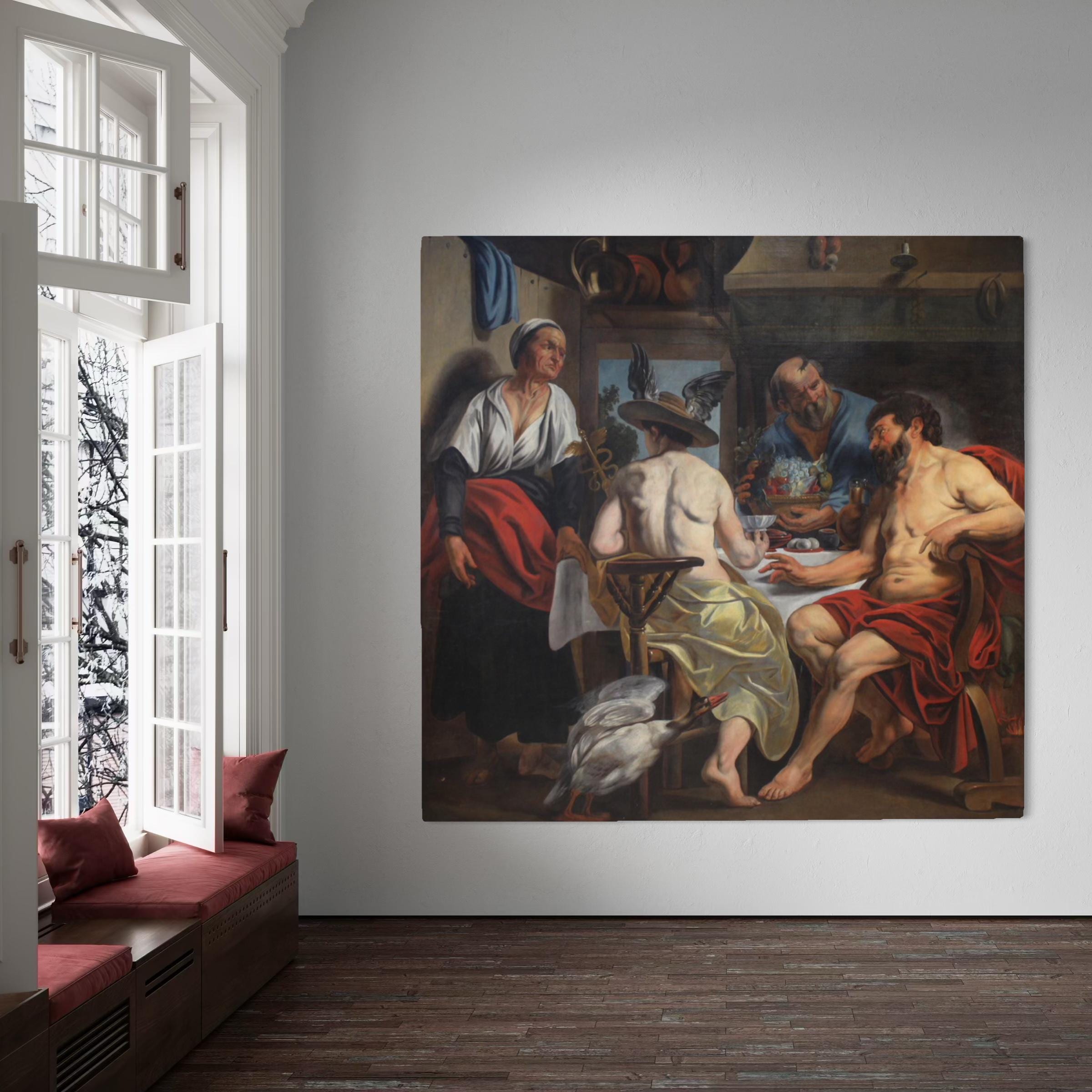 Great Flemish painting from the mid-18th century. Oil on canvas artwork depicting a famous episode from Ovid's Metamorphoses. Jupiter and Mercury, disguised as wayfarers, are rejected by all the inhabitants of a region except for an elderly peasant couple, Philemon and Baucis. At this point, a miracle occurs: the wine never runs out, and the table seems to be renewed. At the foot of the table appears the goose, the only animal the couple owns, which the elders nevertheless wish to offer.