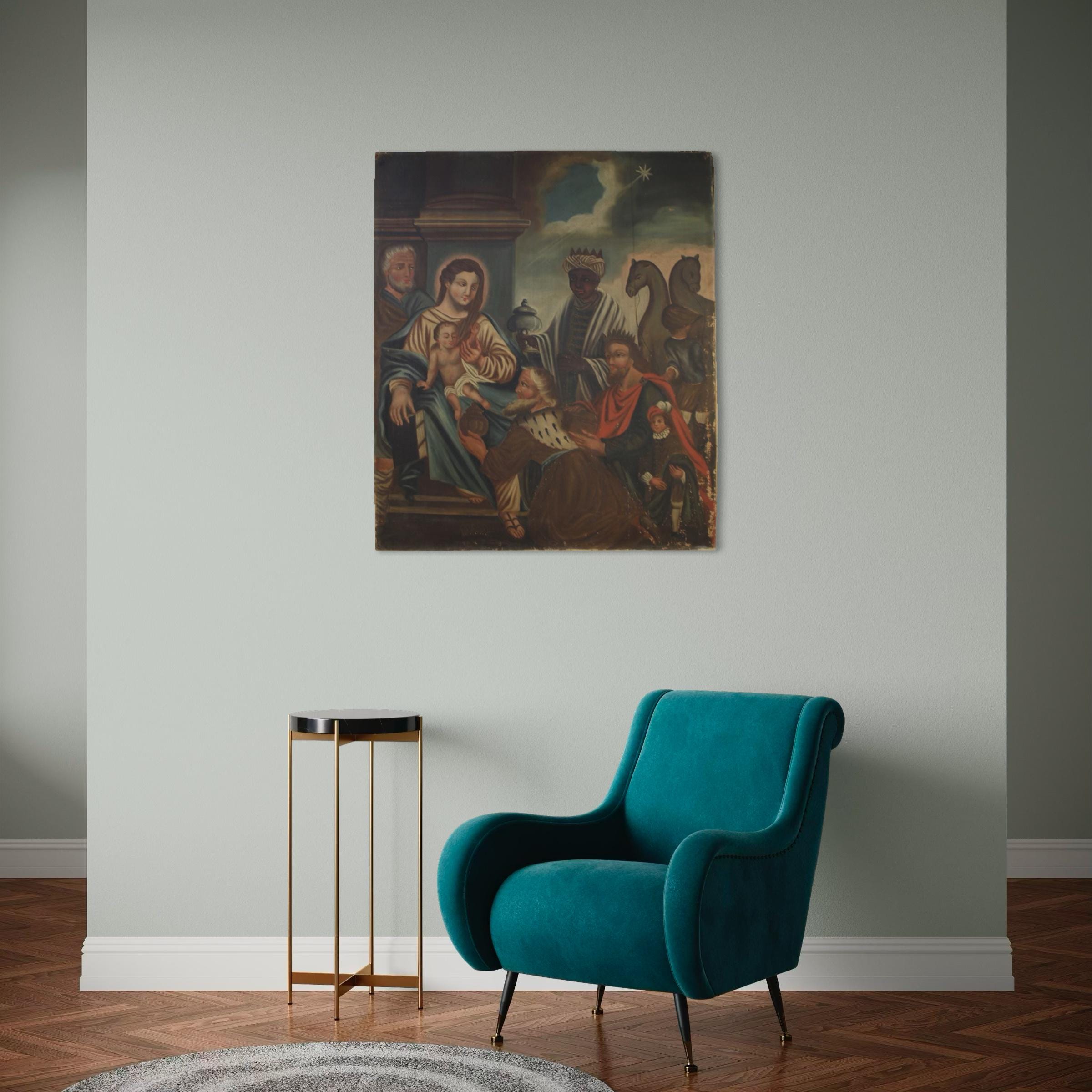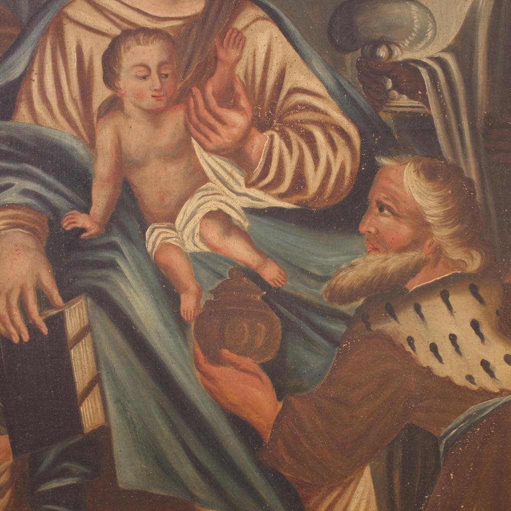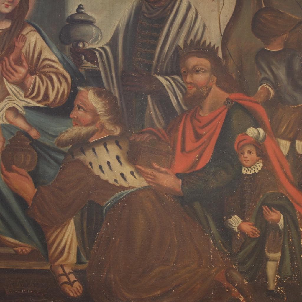Spanish painting from the second half of the 19th century. Oil on canvas, first canvas, artwork depicting a religious subject, the Adoration of the Magi, with a decent level of pictorial quality. A beautifully sized and impactful painting, almost square in shape, with a pleasant décor. The composition, characterized by soft colors, features Joseph and the Madonna and Child on the left, welcoming the Three Kings accompanied by pages and camels. A rustic painting for antique dealers and collectors of religious art. The canvas shows some signs of aging and several paint losses, requiring restoration. The painting has a patina and is in fair condition.
