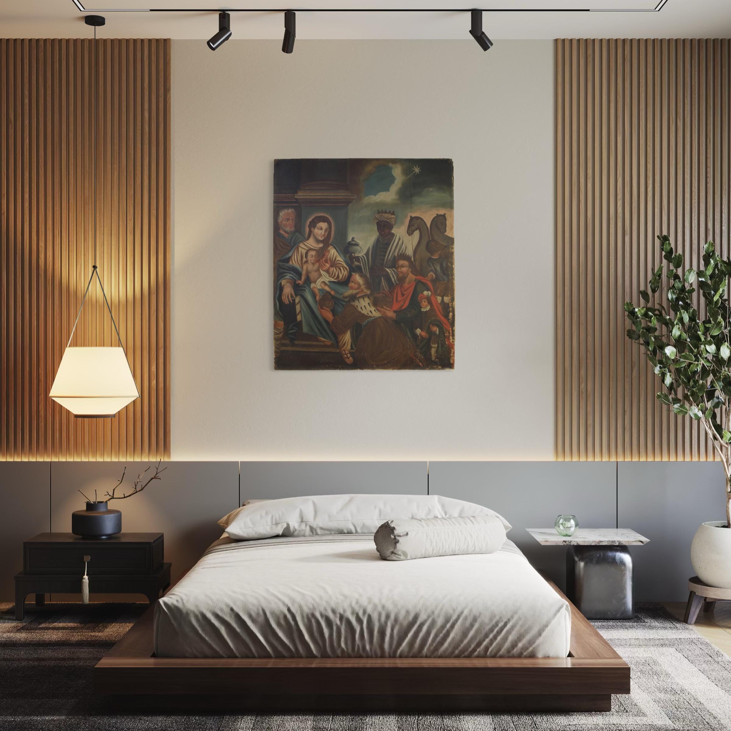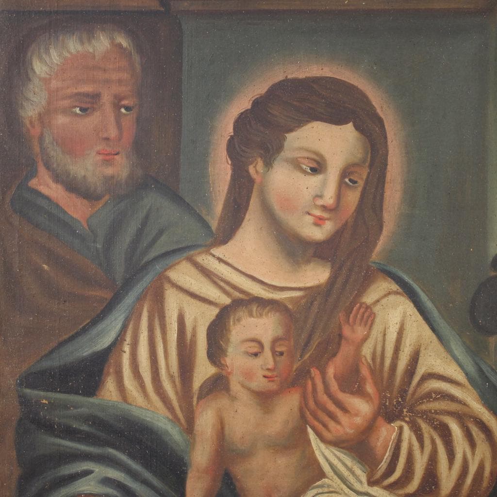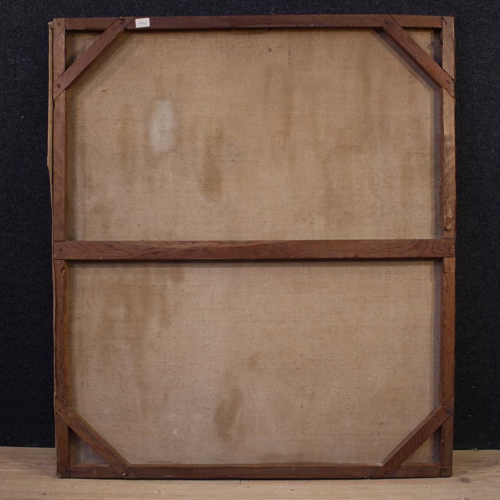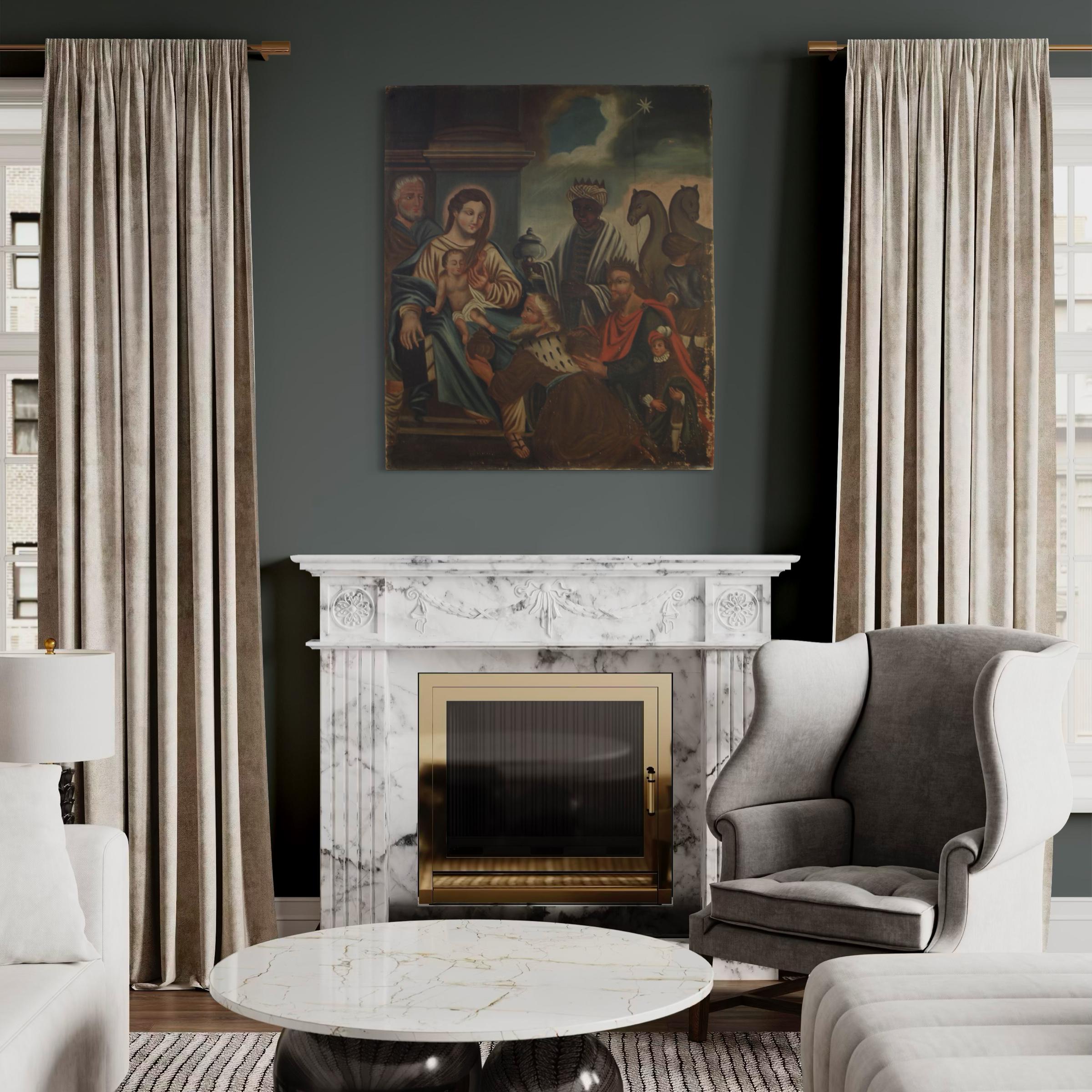 Spanish painting from the second half of the 19th century. Oil on canvas, first canvas, artwork depicting a religious subject, the Adoration of the Magi, with a decent level of pictorial quality. A beautifully sized and impactful painting, almost square in shape, with a pleasant décor. The composition, characterized by soft colors, features Joseph and the Madonna and Child on the left, welcoming the Three Kings accompanied by pages and camels. A rustic painting for antique dealers and collectors of religious art. The canvas shows some signs of aging and several paint losses, requiring restoration. The painting has a patina and is in fair condition.