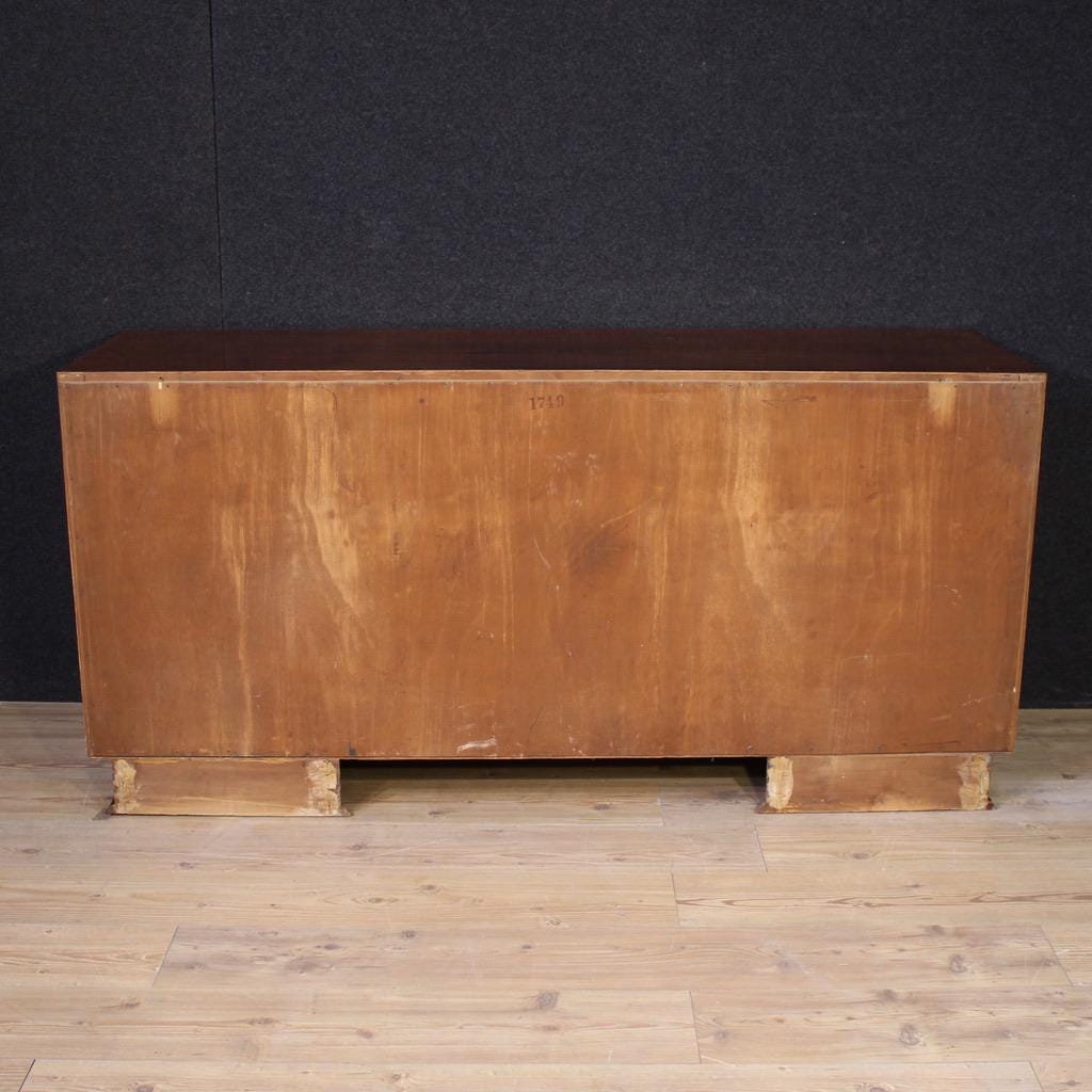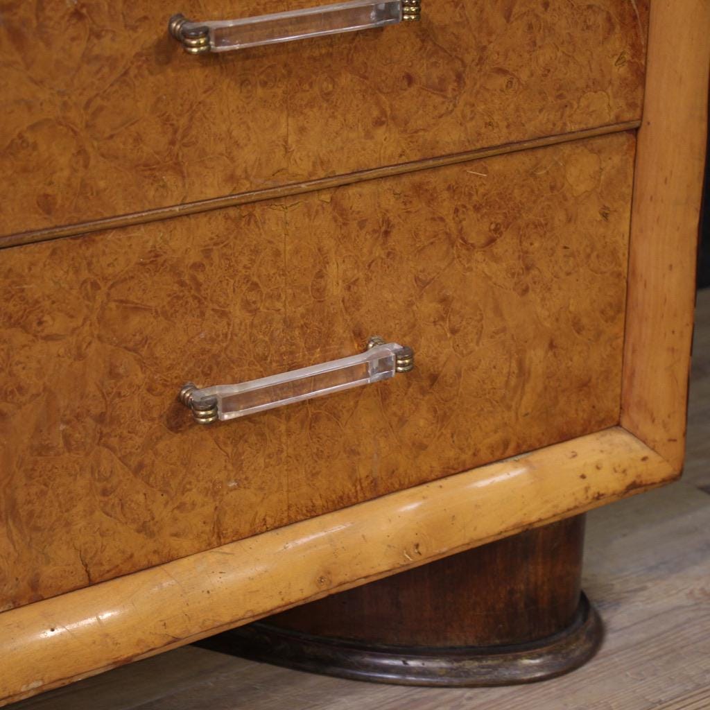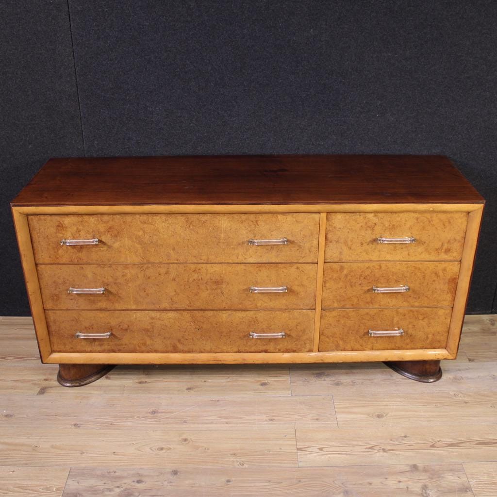 Italian design chest of drawers from the 1970s. Beautifully designed and beautifully carved, this chest of drawers is veneered in palisander, burl, and fruitwood. It features six spacious drawers, adorned with plexiglass and gilded brass handles. Constructed from a single, non-divisible block, only the drawers are removable for easy movement and placement within the home.