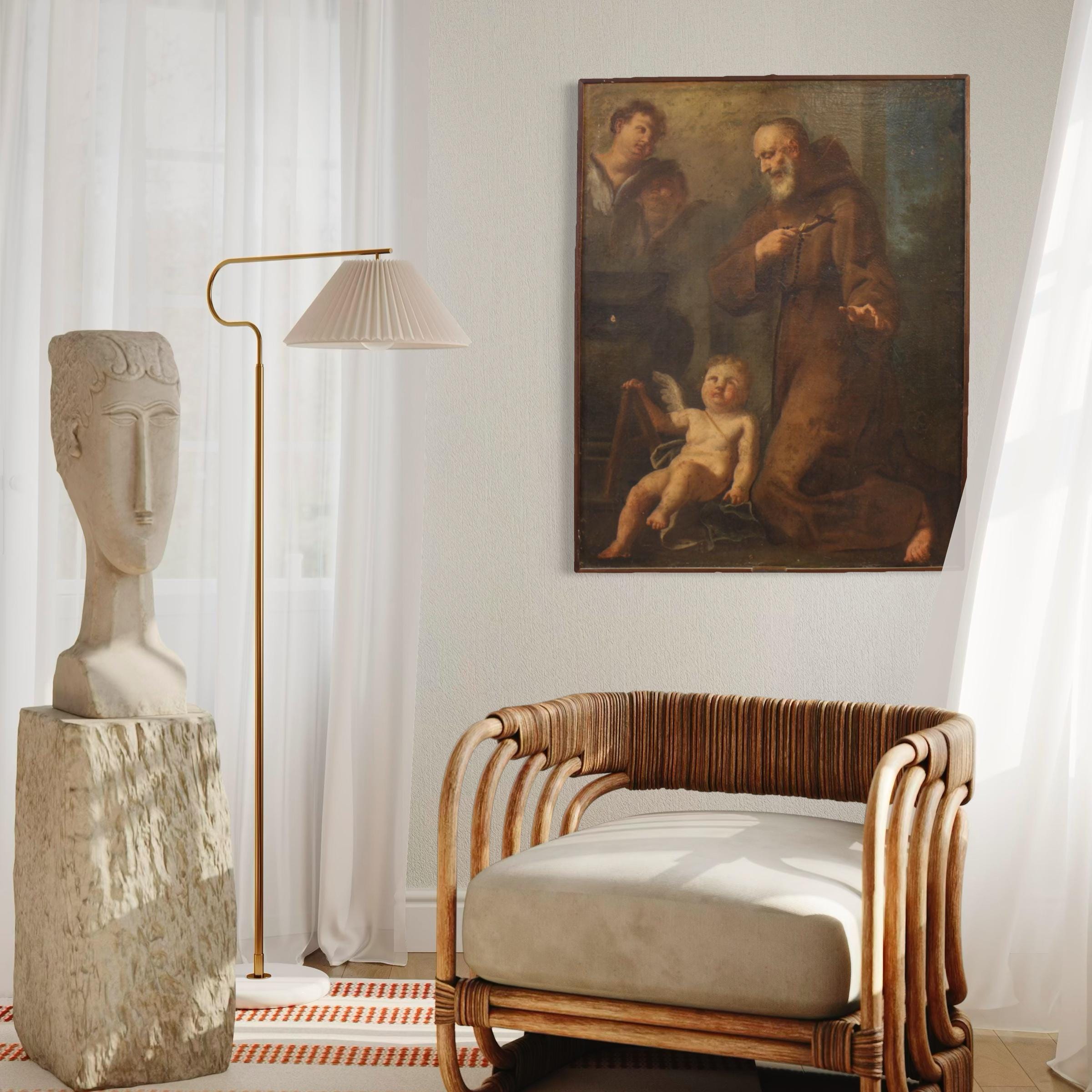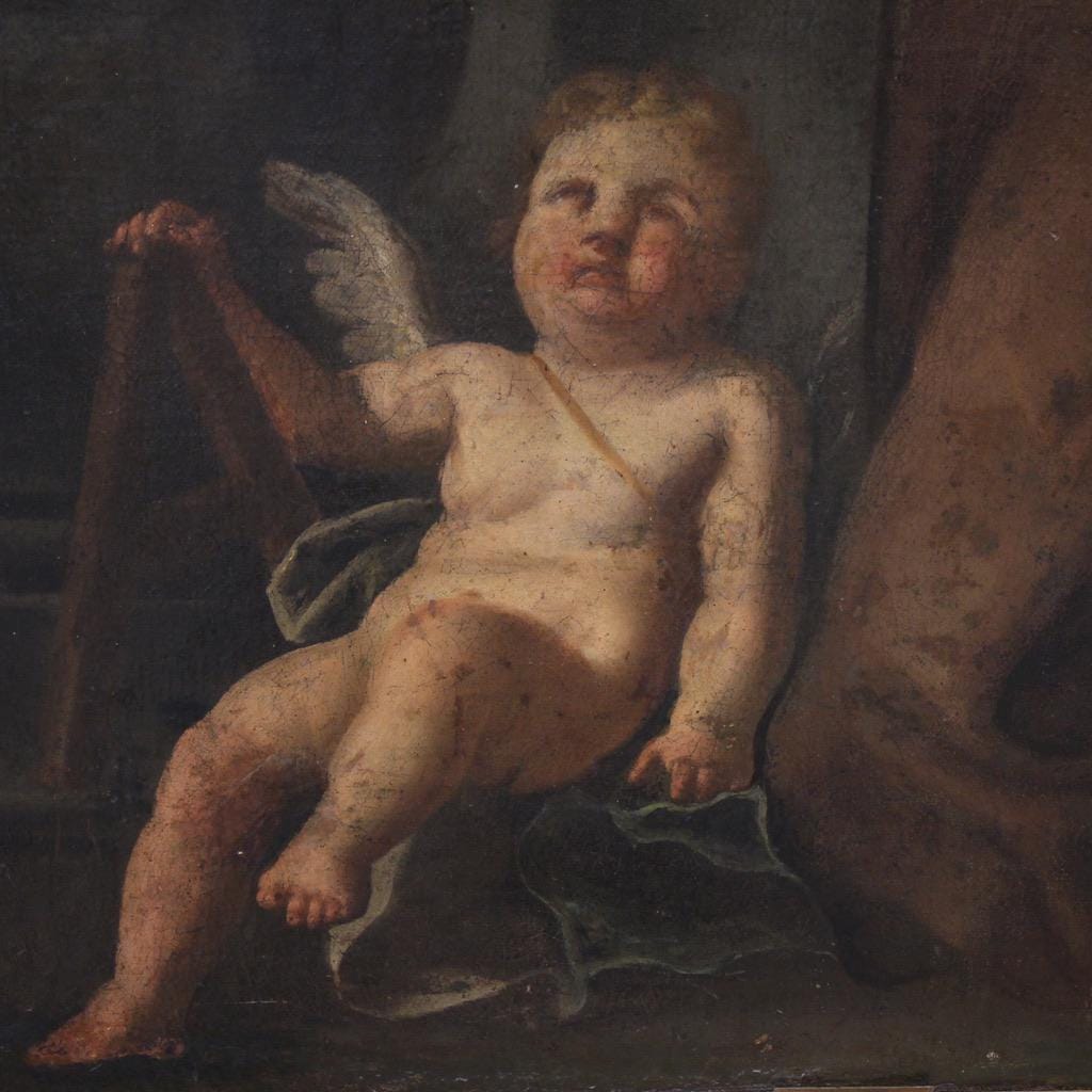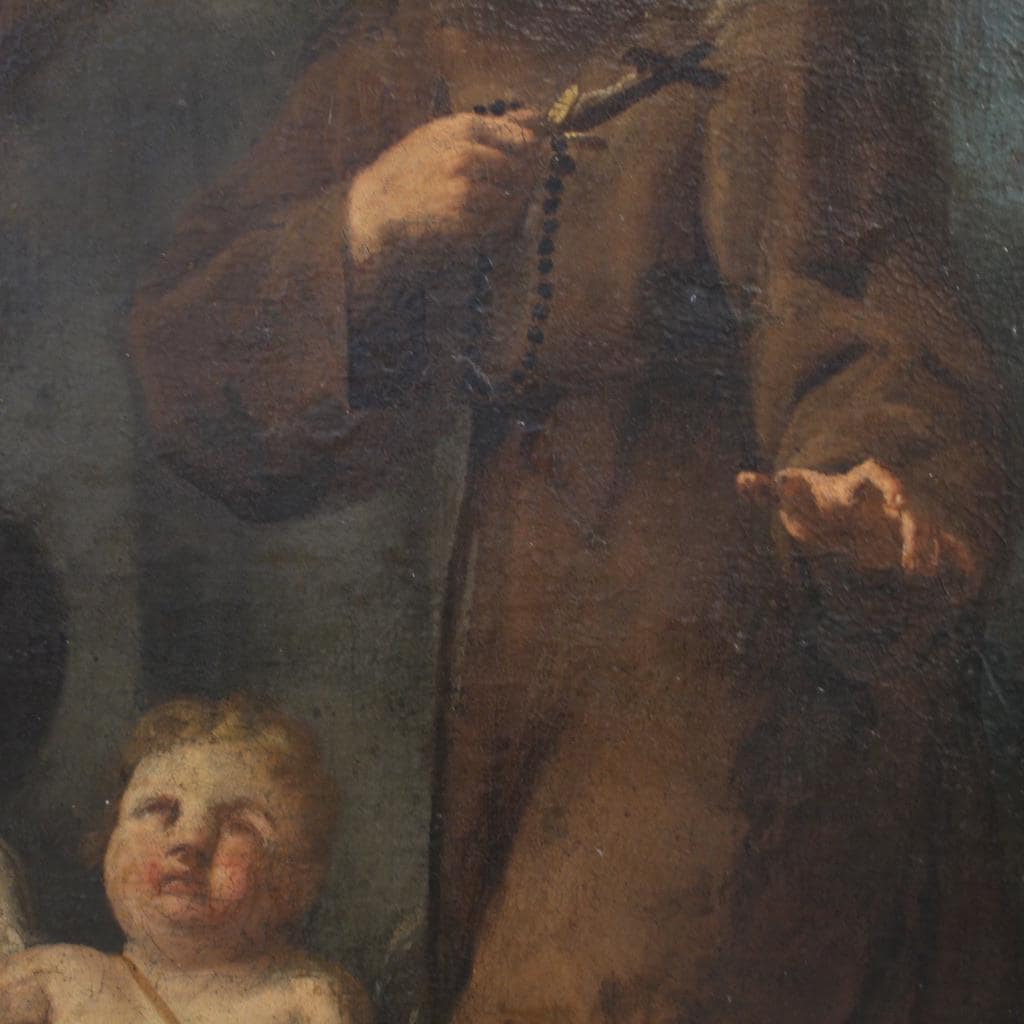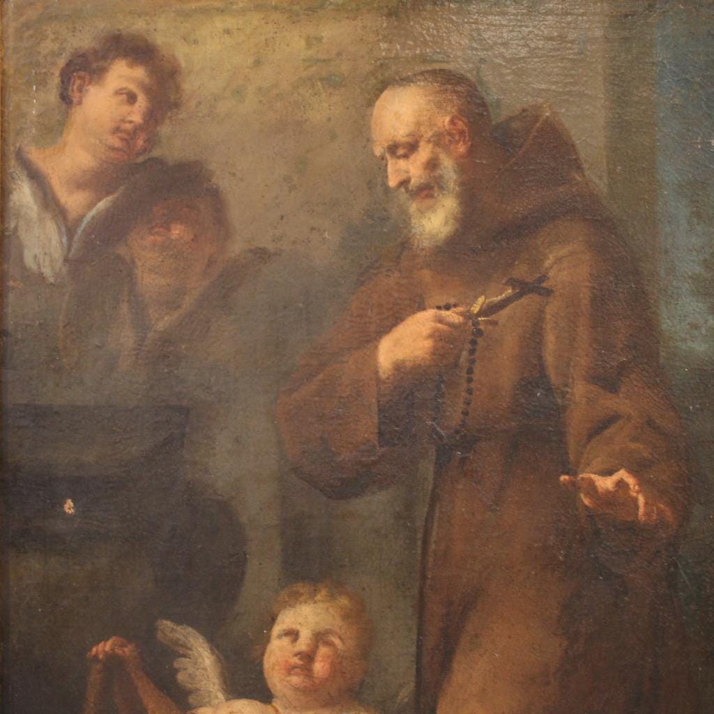 Antique 17th-century Italian painting. Oil on canvas artwork depicting a religious subject, a Franciscan saint in prayer with cherubs, of excellent pictorial quality. The vertically arranged painting, beautifully proportioned and spacious, depicts the saint kneeling in the traditional robes of his order. The rosary and crucifix in the friar's hands are also present. Note the cherub holding a compass in the lower left. Compasses were used in ancient times to represent God, the perfect creator, but also to symbolize God's wisdom entrusted to the words of a saint.