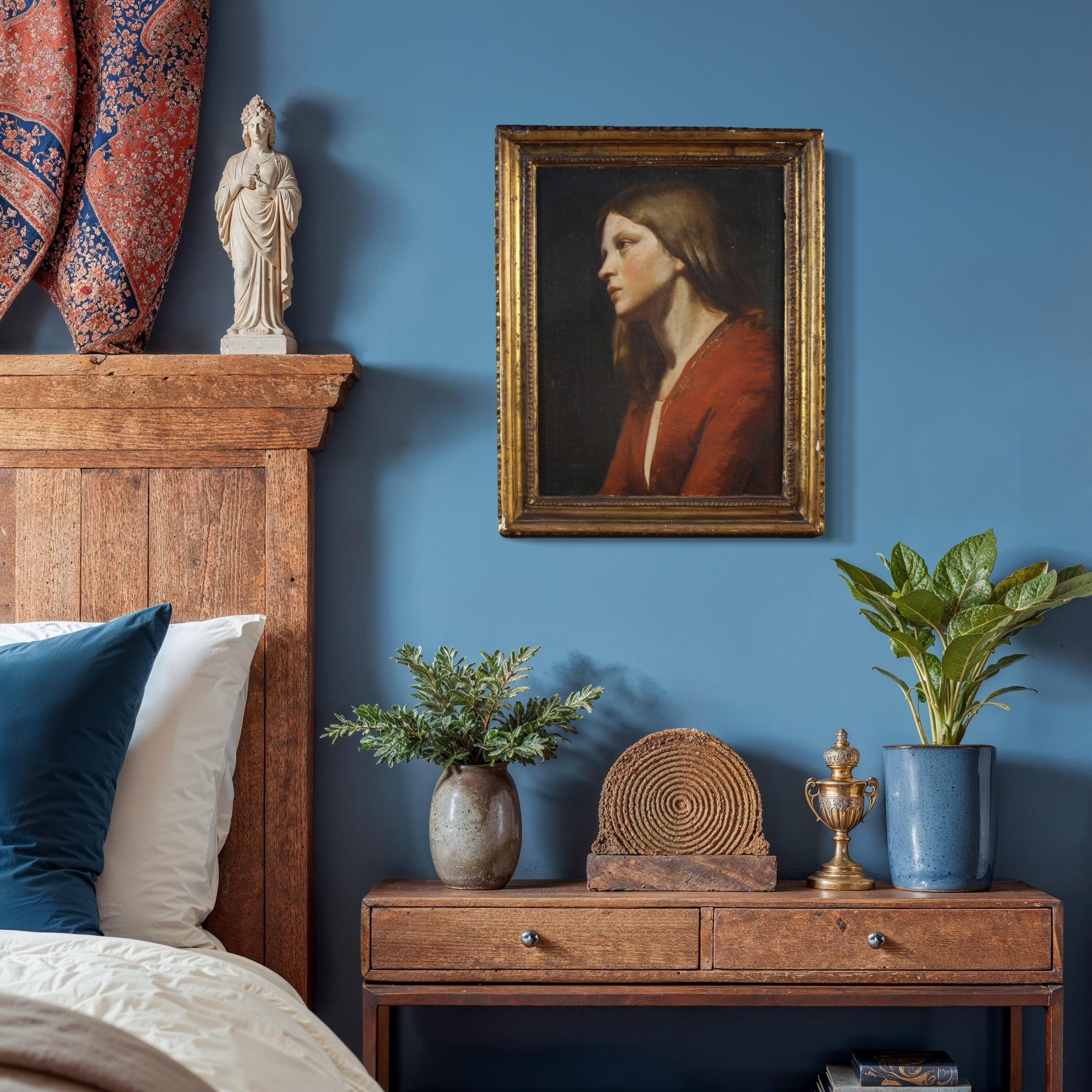 The modeling of the face is indeed the most successful element; the light caresses the forehead, cheekbones, and nose with soft, progressive tonal transitions. The complexion, slightly rosy on the cheeks, reveals a refined chromatic sensibility, far removed from any academic rigidity. The loose hair, rendered with fluid brushstrokes, frames the face without stiffening it.