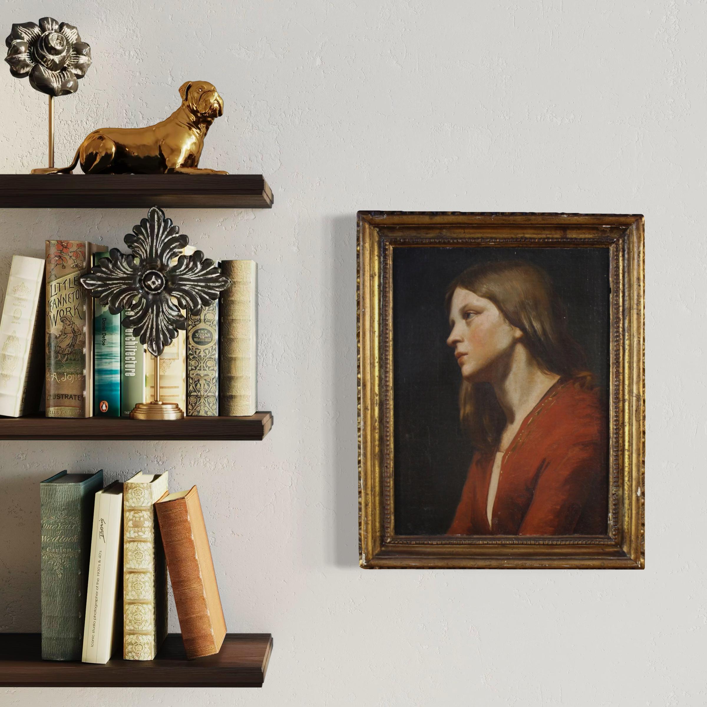 A splendid Italian painting from the mid-19th century. Oil on canvas, first canvas, painting depicting a marvelous portrait of a young woman, rendered with great delicacy of light and a refined psychological sense. The young woman emerges from a solid dark background, a choice that focuses all attention on the subject's face.