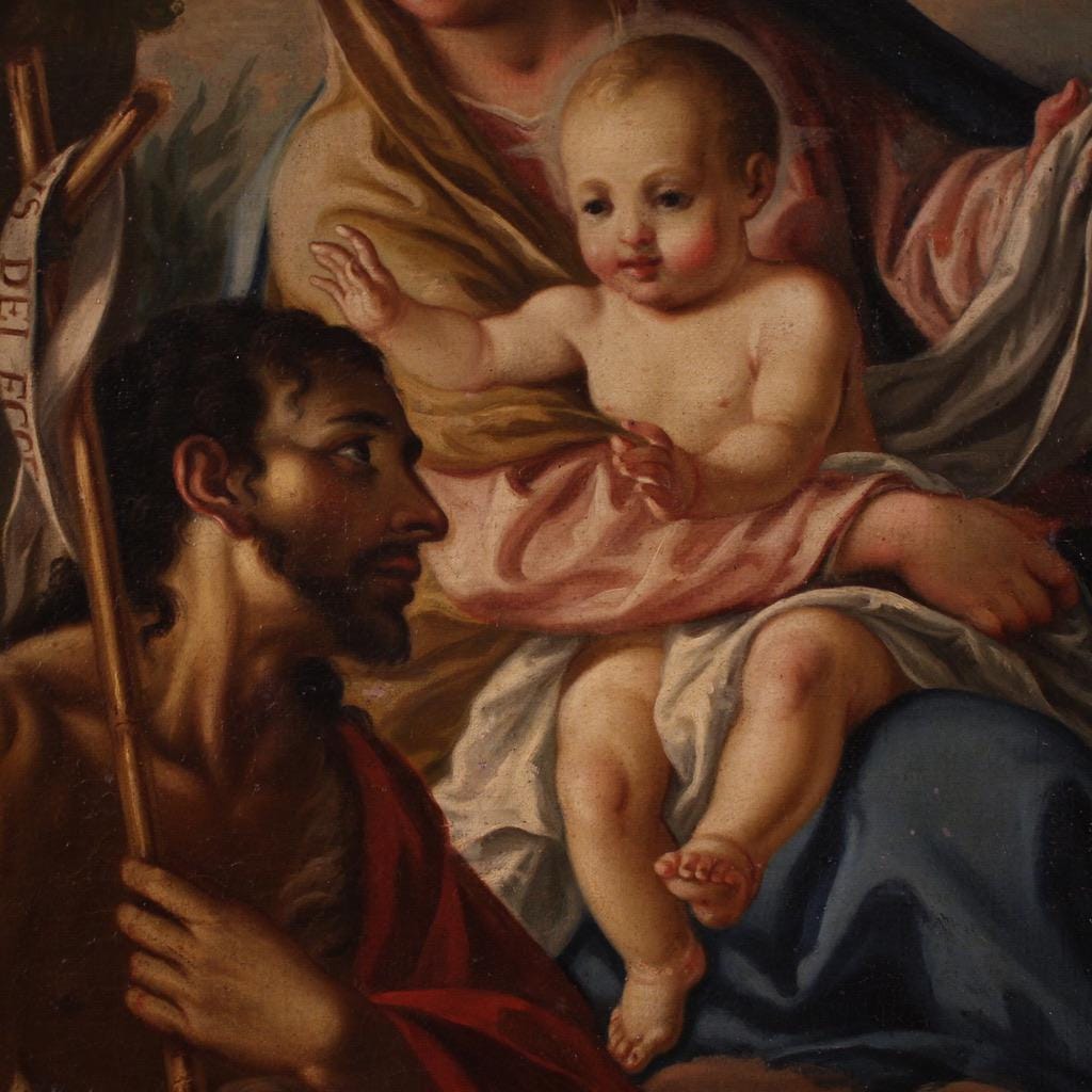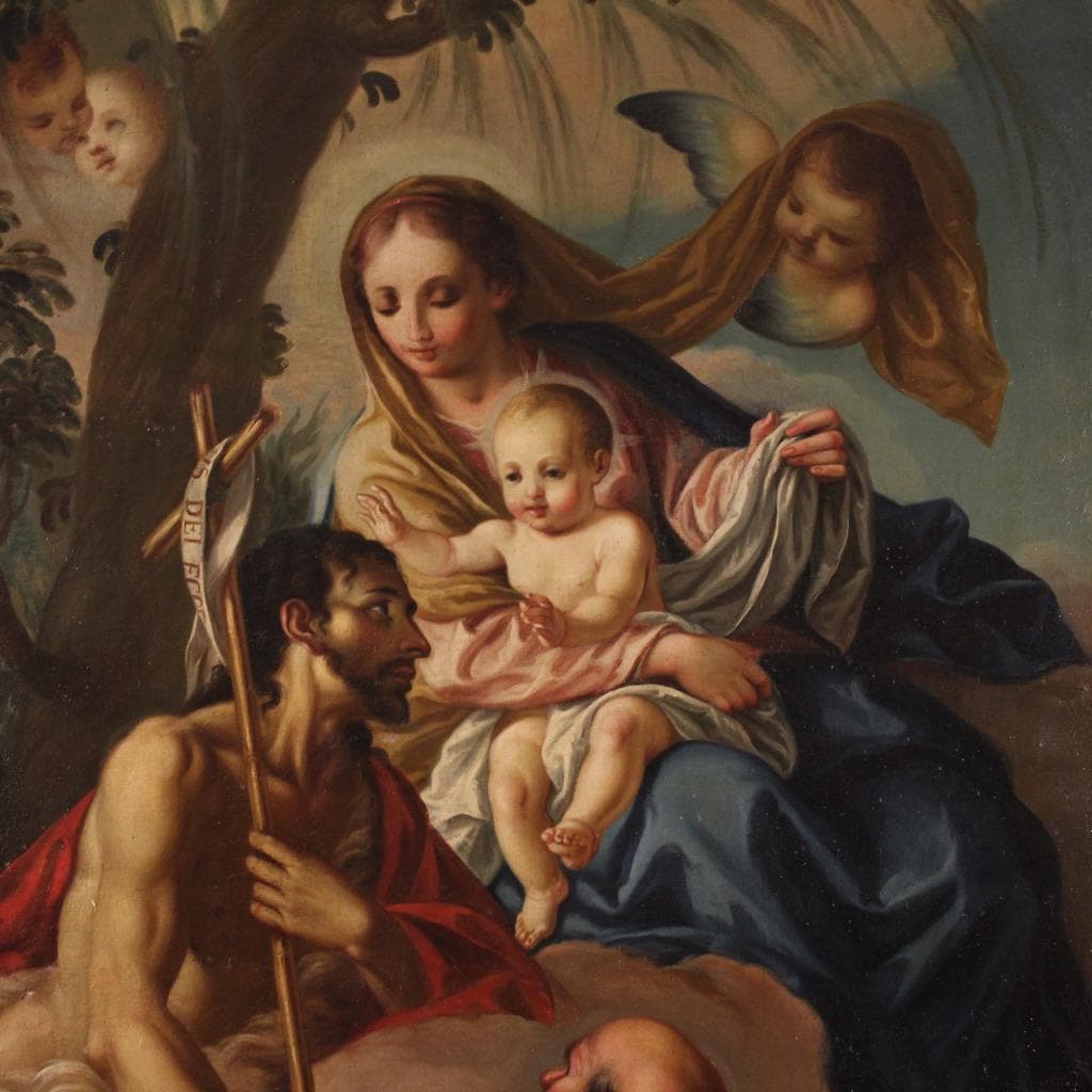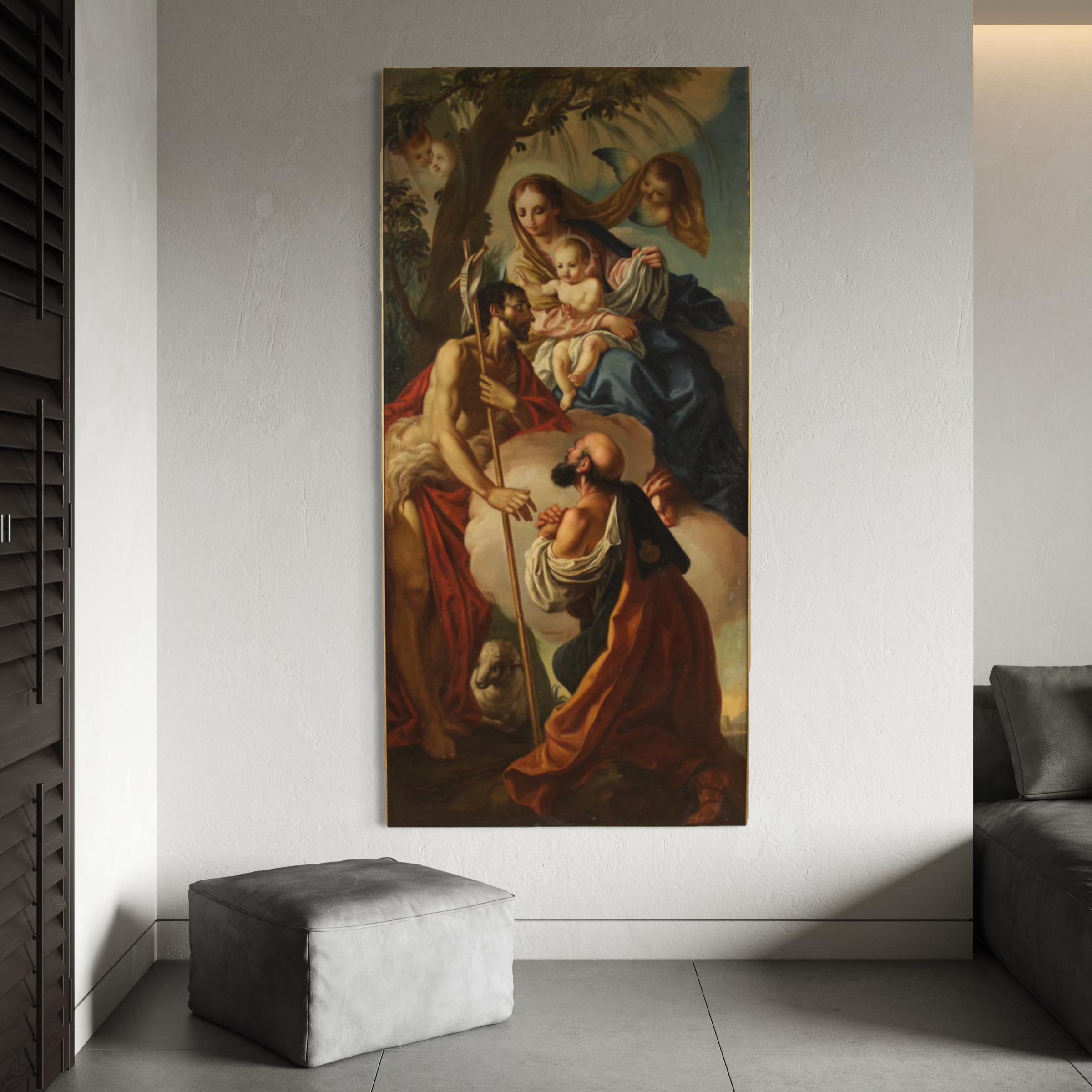 Great Italian painting from the second half of the 18th century. Oil on canvas artwork depicting a religious subject, Madonna and Child, Saint John the Baptist, and Saint Roch, of excellent pictorial quality. The vertically arranged painting is characterized by vibrant colors and a pleasing perspective, ideal for antique dealers and collectors of sacred art.