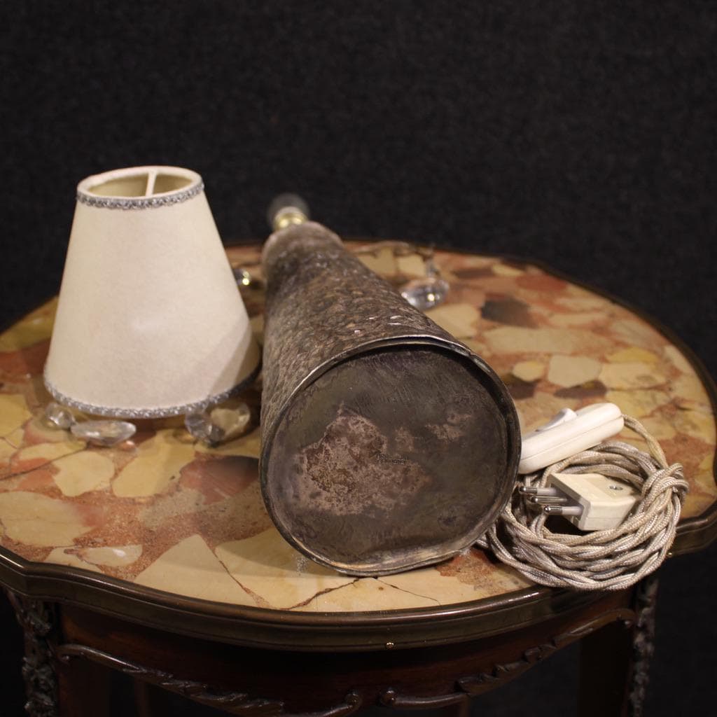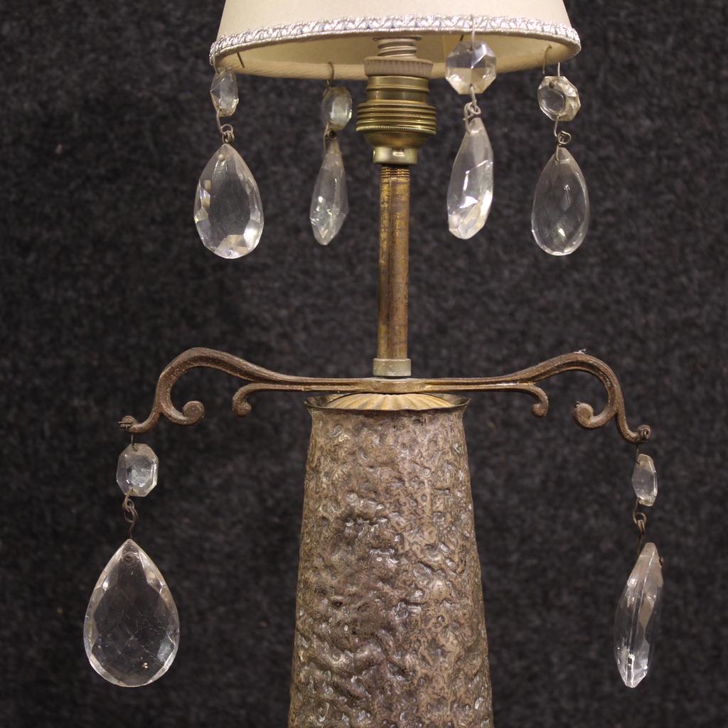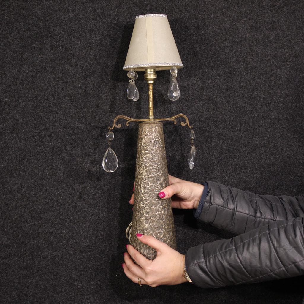 This item has a beautiful patina, perfect for antique dealers and collectors of 20th-century Italian design. The lamp body is 31 cm tall. The lamp comes complete with electrical wiring, requiring overhaul for proper functioning. The lamp shows some signs of age, but is structurally sound and complete. Overall, it is in fair condition.