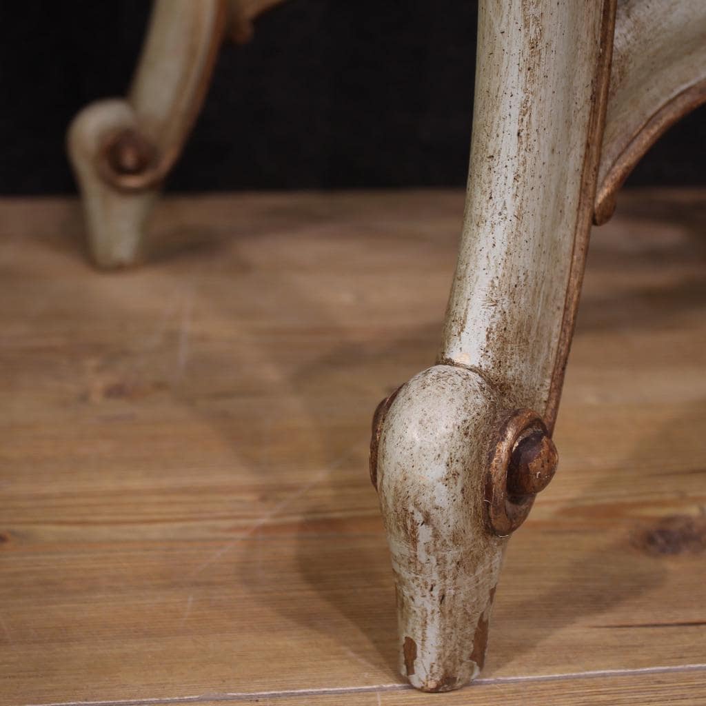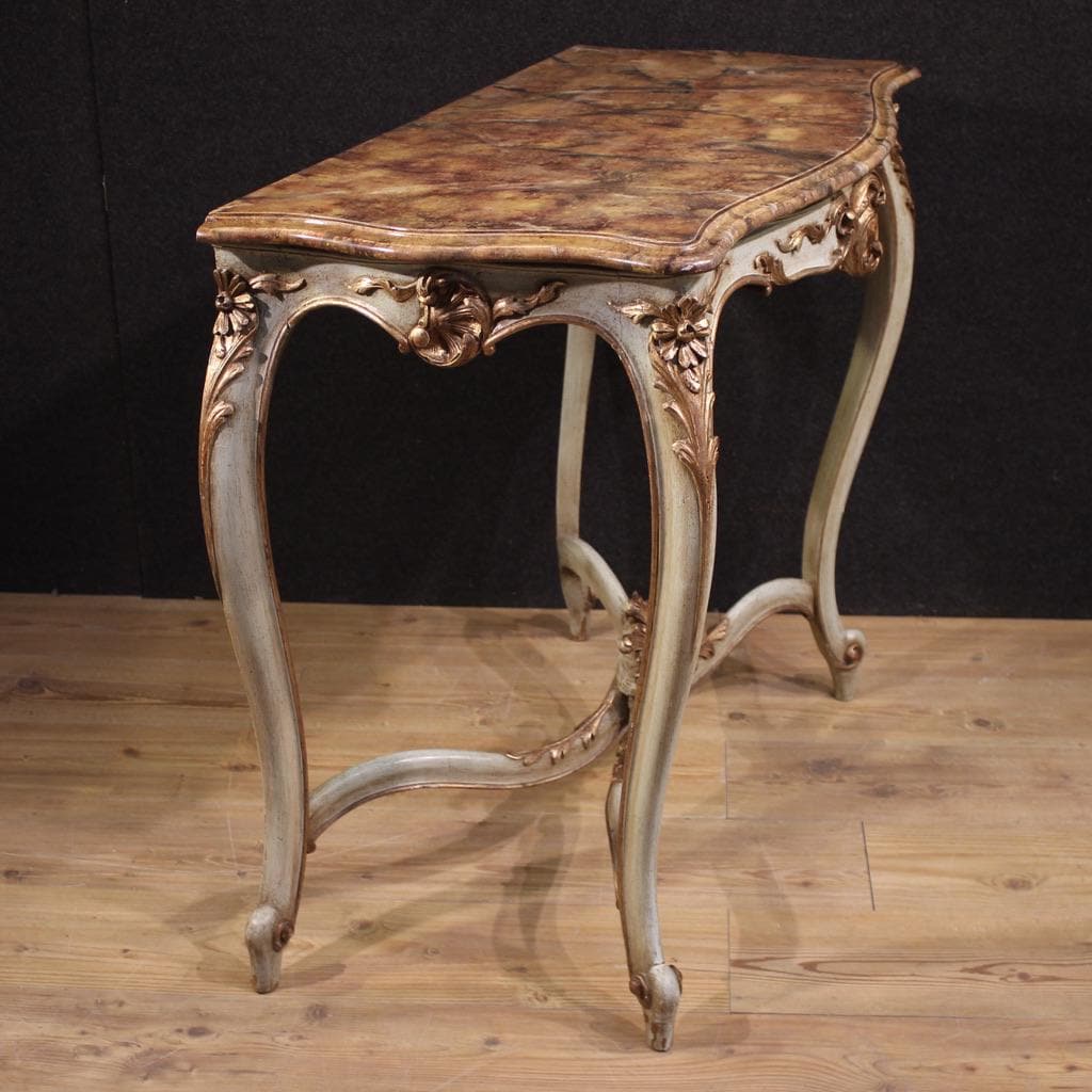 French console table from the mid-20th century. Finely carved, lacquered, and silvered wood furniture in the Louis XV style, of beautiful lines and attractive furnishings. The wall console table features a lacquered faux-marble wooden top, of good size and quality. The furniture rests on four sturdy legs with a central joint and curled feet (see photo). This well-proportioned console table can easily be placed in various locations around the home, making it ideal for antique dealers and interior decorators. In good condition.