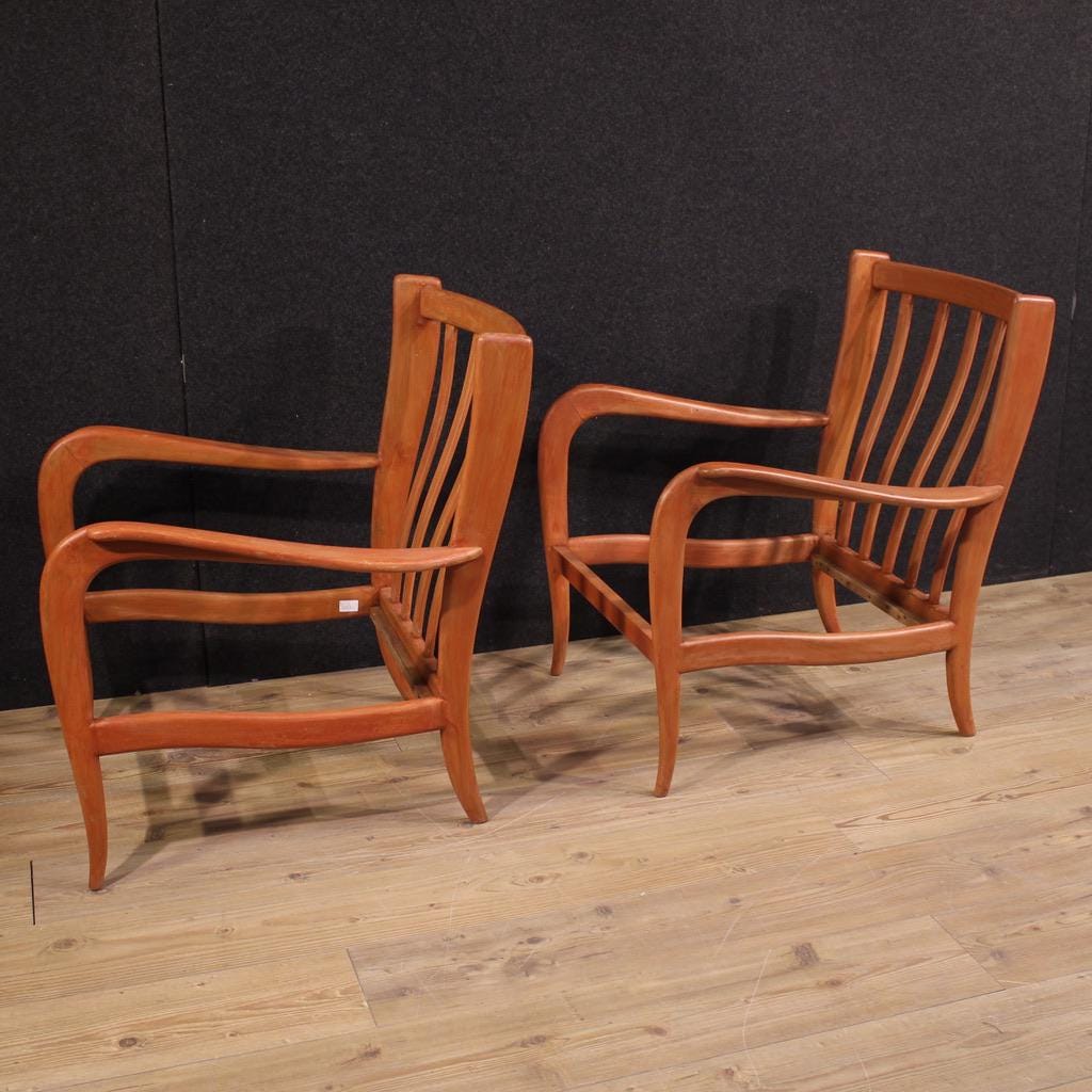 A pair of Italian armchairs from the 1970s. Carved cherry wood furniture in the style of Paolo Buffa, with beautiful lines and a pleasing décor. The seat structure and cushions are missing, requiring expert upholstery. These well-sized armchairs are ideal for a living room or study, and are suitable for antique dealers and interior decorators. Structurally sound and solid, they require restoration. Seat height 27 cm