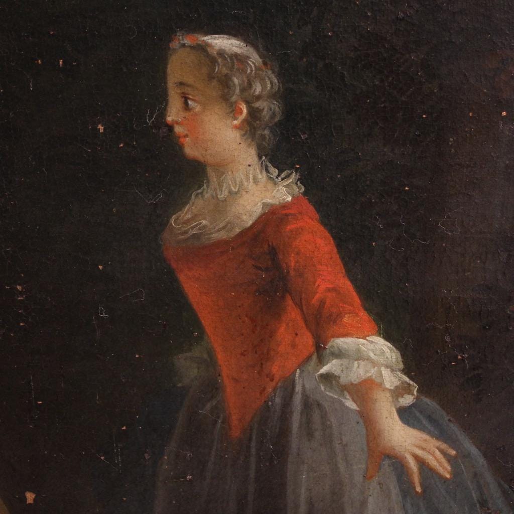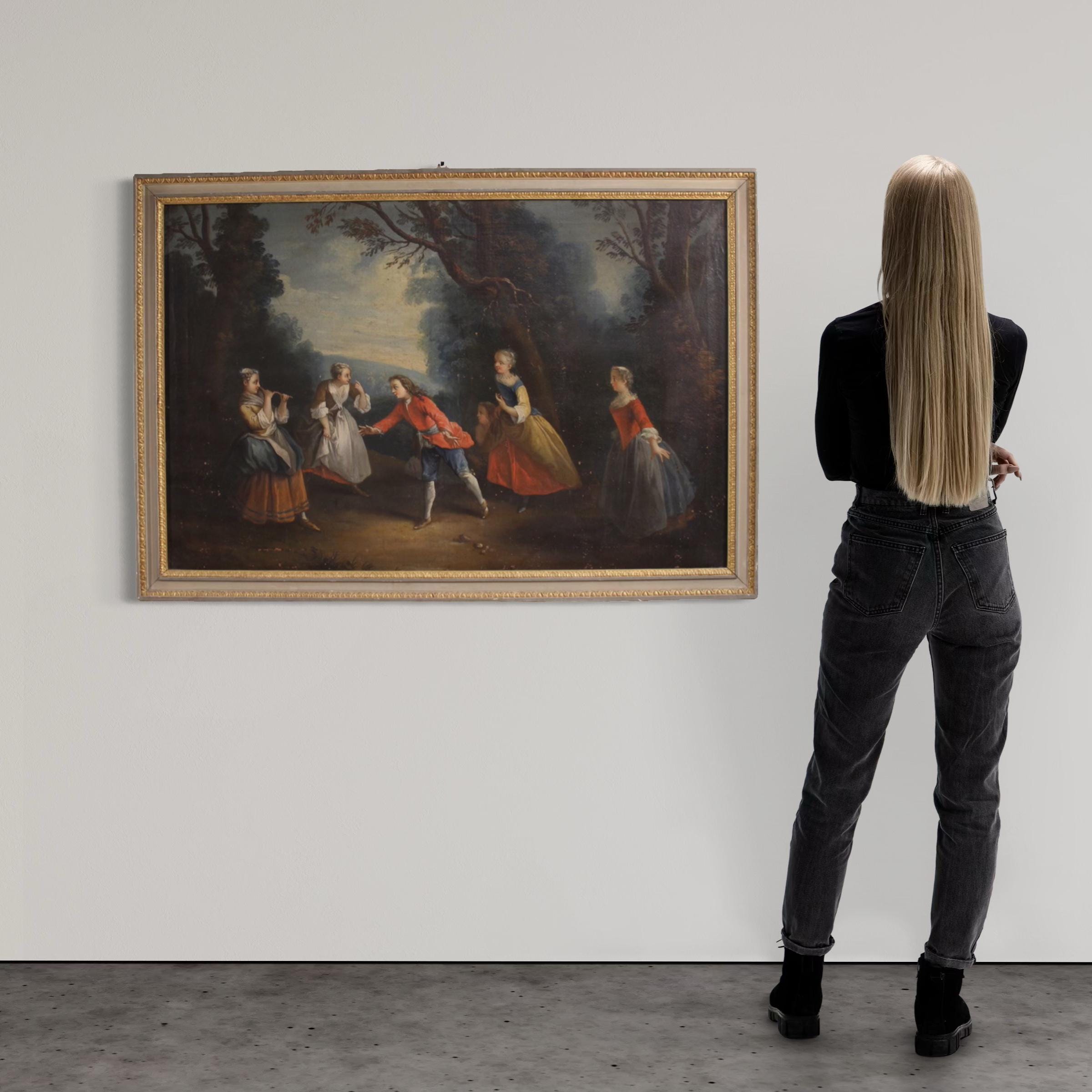 Antique French painting from the second half of the 18th century. Painting oil on canvas, first canvas, depicting an early reinterpretation of the famous masterpiece by Nicolas Lancret (1690-1743), Children Playing Outdoors. This painting mirrors the original, with a slightly different, decidedly brighter setting. The beautiful, non-contemporary wooden frame is pleasantly carved, gilded, and painted (see photo).