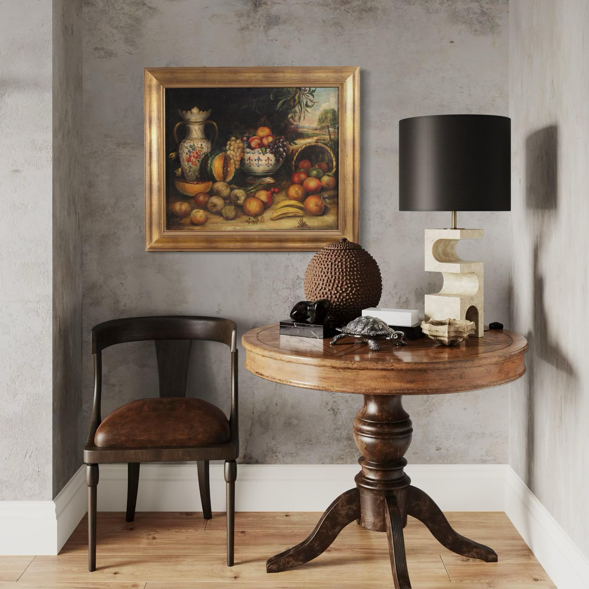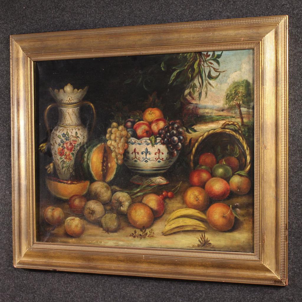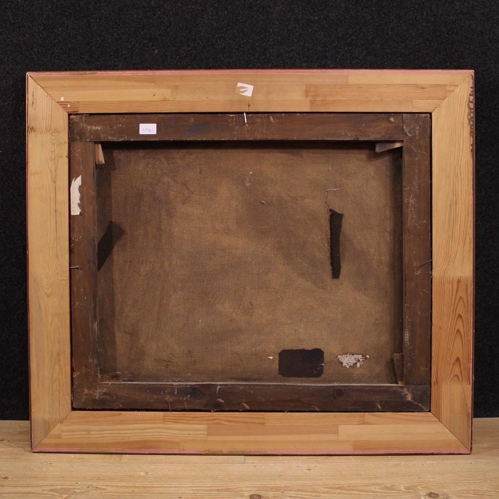 A rustic painting ideal for a kitchen or living room, for antique dealers and interior decorators. The painting has undergone conservative restoration, with visible patches on the back of the canvas (see photo) and recoloring in some areas. In good condition. Internal dimensions: H 59 x W 71.5 cm.