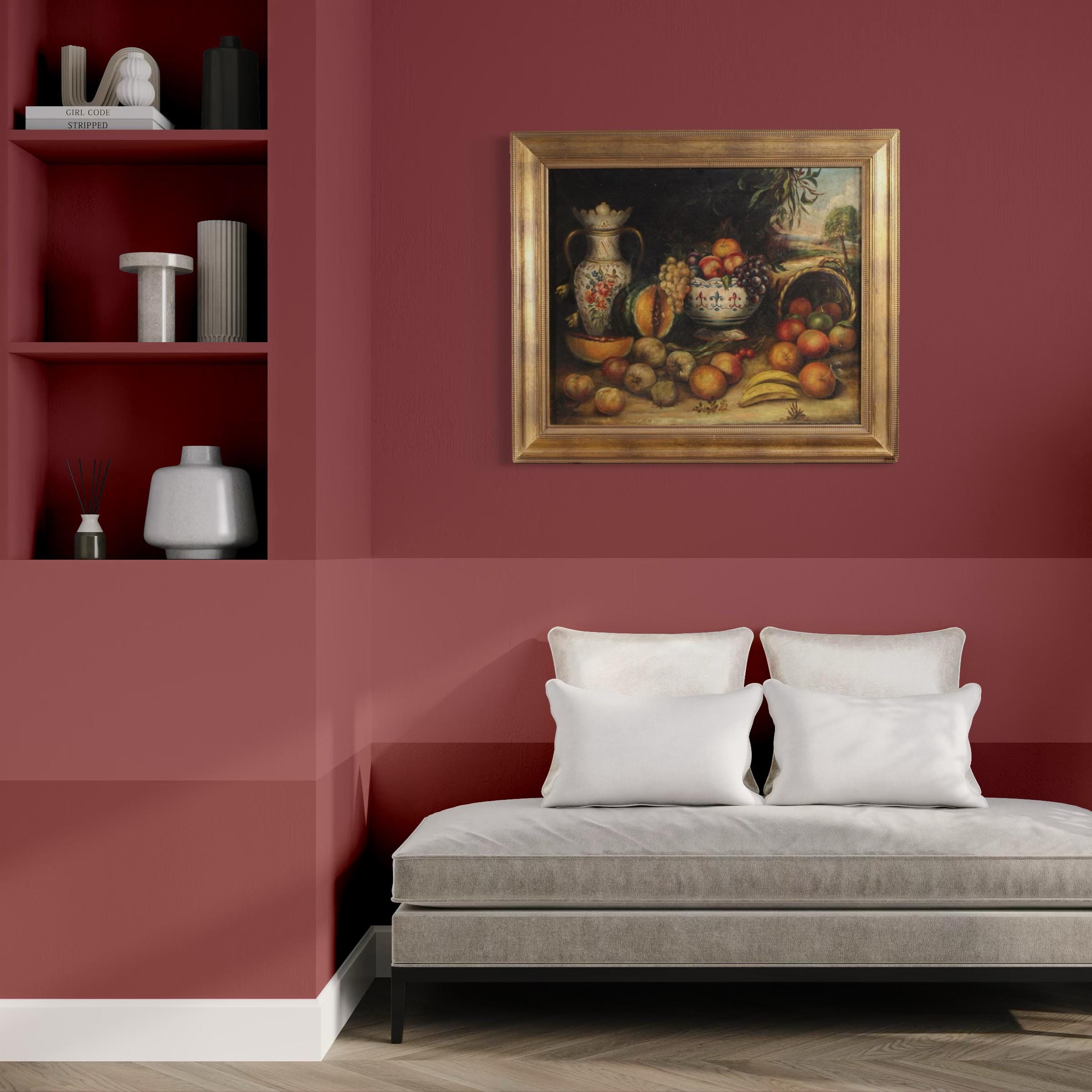 Spanish painting from the first half of the 20th century. Oil on canvas artwork in the antique style depicting a still life with fruit and ceramics, with good pictorial quality. The modern, carved and gilded (bronze-tinted) wood and plaster frame is beautifully decorated. The painting unfolds horizontally, enriched with numerous details, with a landscape in perspective in the background.