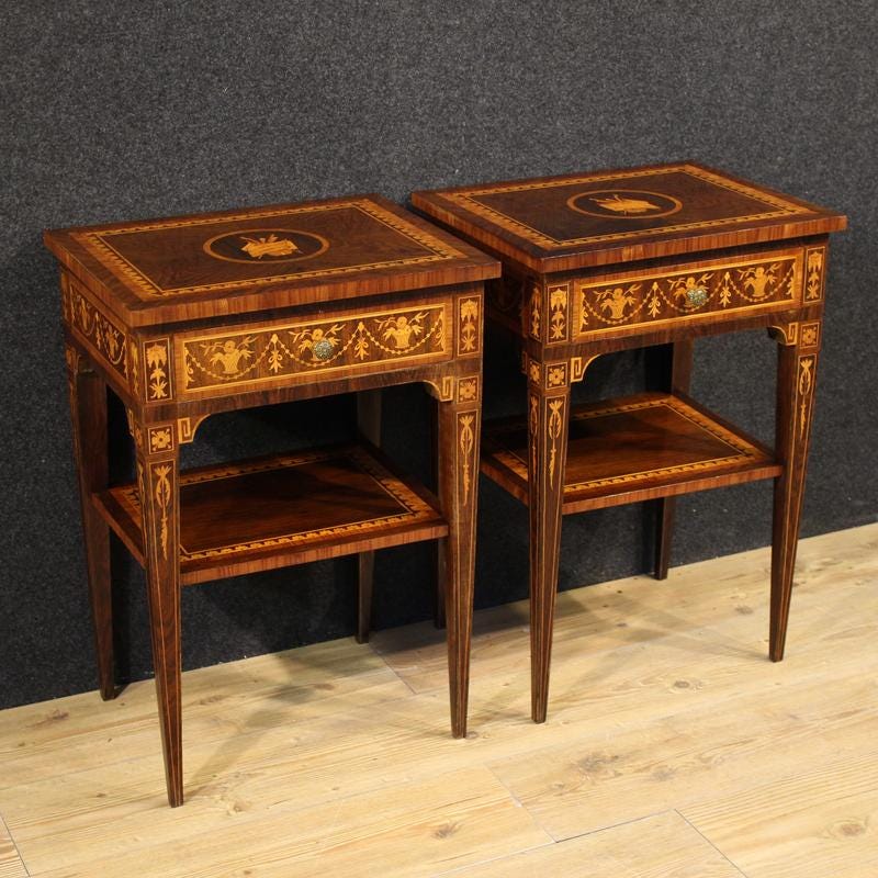 A pair of mid-20th-century Italian bedside tables. Finely inlaid Louis XVI-style furniture with floral decorations and musical instruments in walnut, rosewood, palisander, maple, and fruitwood. These tall-legged tables offer good stability and solidity, each with a drawer, a matching wooden top, and a second shelf underneath. These night stands are ideal for a bedroom or living room, and are ideal for antique dealers and interior decorators. Structurally sound and in good condition.