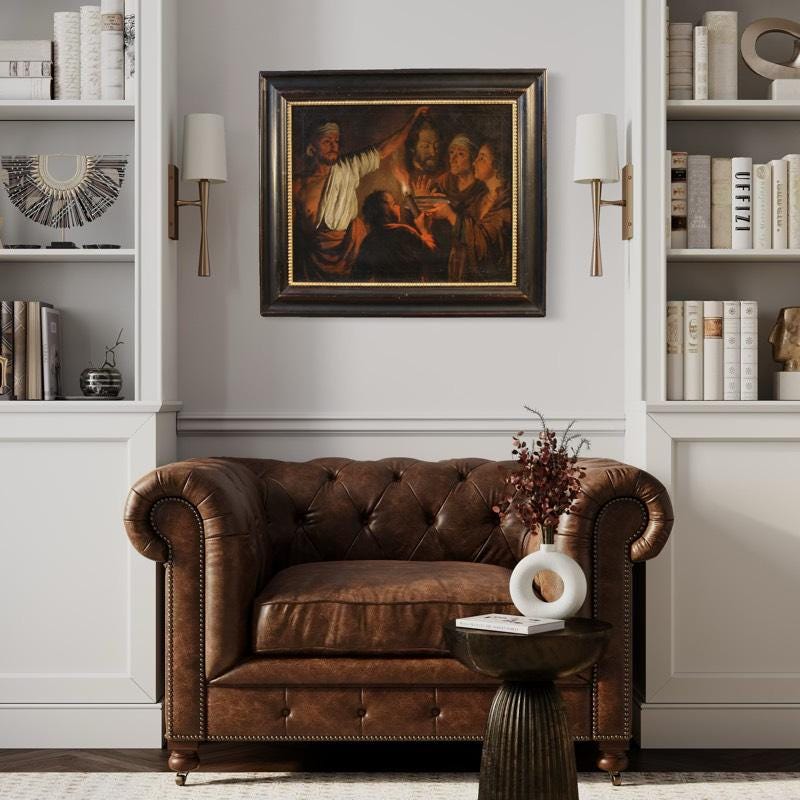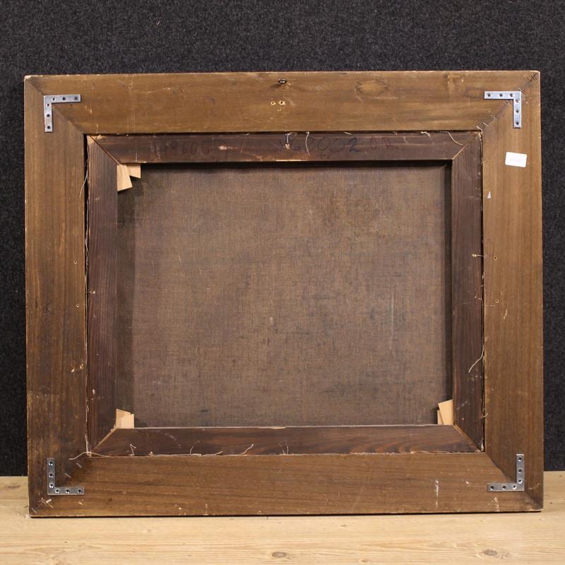 A highly decorative painting, ideal for classic-style spaces, professional studios, or historic homes. A modern, antique-finish frame in lacquered and gilded wood. The painting has already been restored with re-lining, replacement of the stretcher, and re-coloring in small areas. Overall, in good condition. Internal dimensions: H 51.5 x W 64 cm.