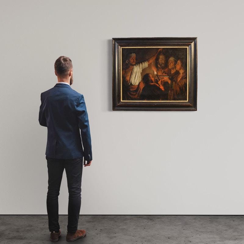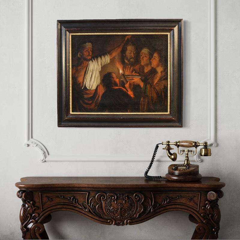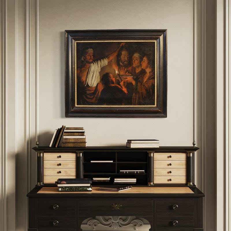 A refined Flemish painting from the first half of the 19th century. Oil on canvas artwork depicting Salome with the head of Saint John the Baptist. Based on a famous invention by Matthias Stomer (1600-1650), a master of Northern Caravaggism, the composition faithfully reproduces the original now exhibited at the National Gallery in London, from which it inherits its dramatic power and powerful contrast between light and shadow.