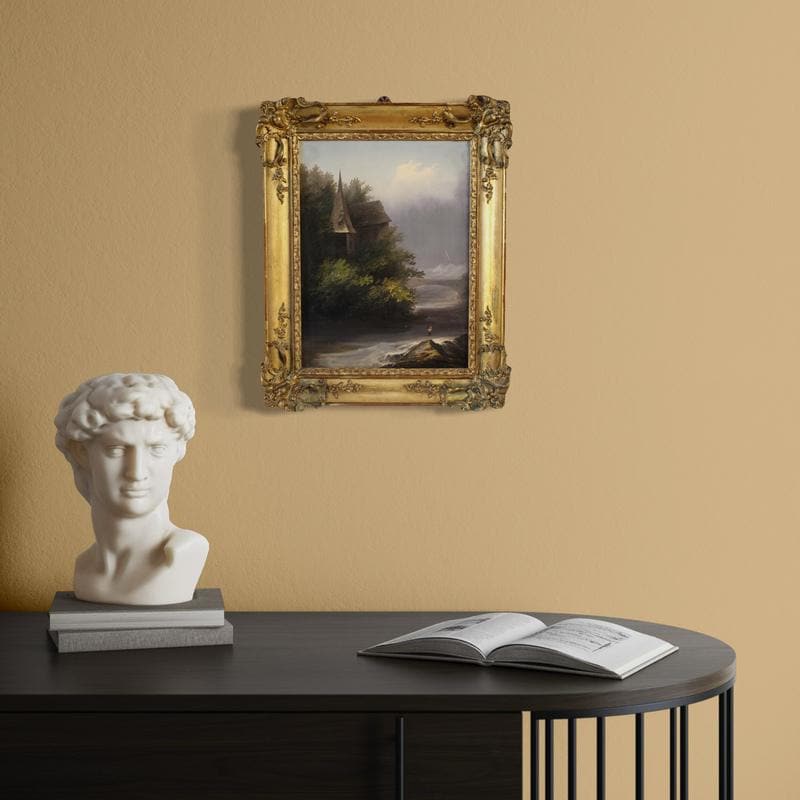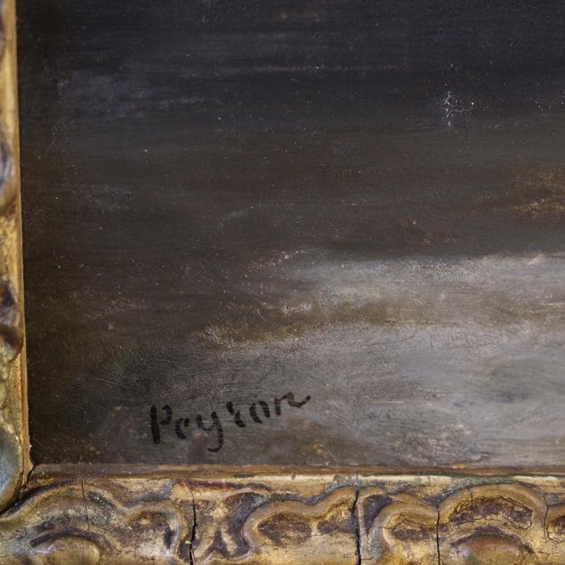 Painting signed Peyron lower left, attributable to the French painter Jacques Guillaume Achille Peyron, a talented landscape painter from Saint-Germain-en-Laye who participated in the Paris Salon between 1831 and 1844 (the artwork does not currently come with a certificate, but it can be requested upon payment of the relevant additional costs). This painting is ideal for refined, classical or contemporary settings, capable of bringing the poetry of the Romantic landscape into the home. The scenic, contemporary frame in wood and gilded plaster is beautifully decorated, with some small losses and signs of aging (see photo). The painting is in overall good condition. Internal dimensions: H 35 x W 26.5 cm.