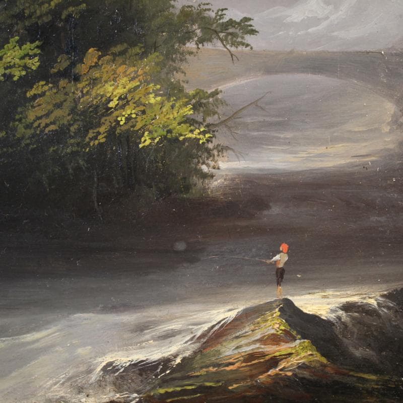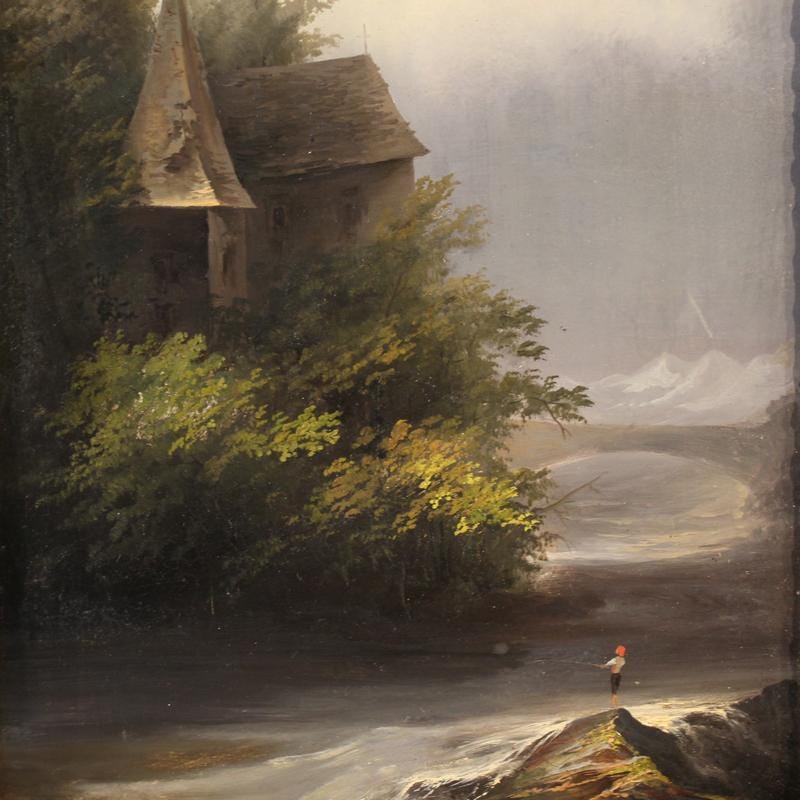 On the right, along the stream bank, we see a small, solitary fisherman, lending a poetic and contemplative quality to the scene. The composition, constructed with a balance of shaded areas and bright openings, reveals a painting style sensitive to the tradition of European Romantic landscapes. The rendering of the moving water and the illuminated foliage, achieved with lively and vibrant brushstrokes, is particularly effective.