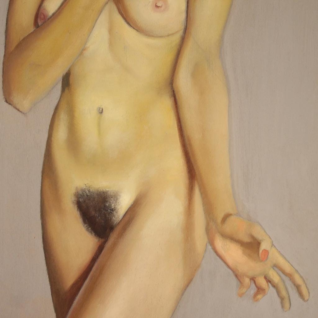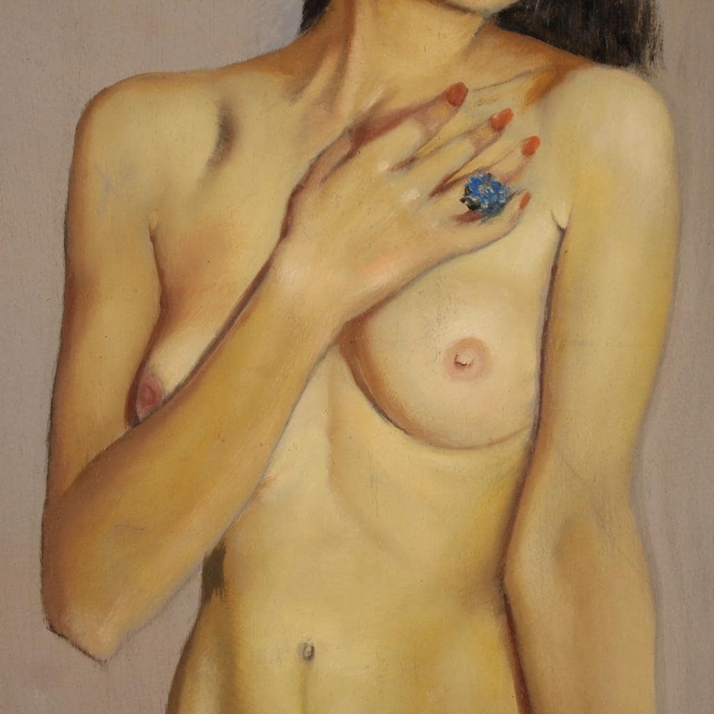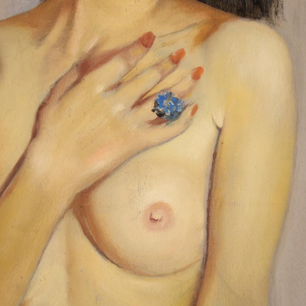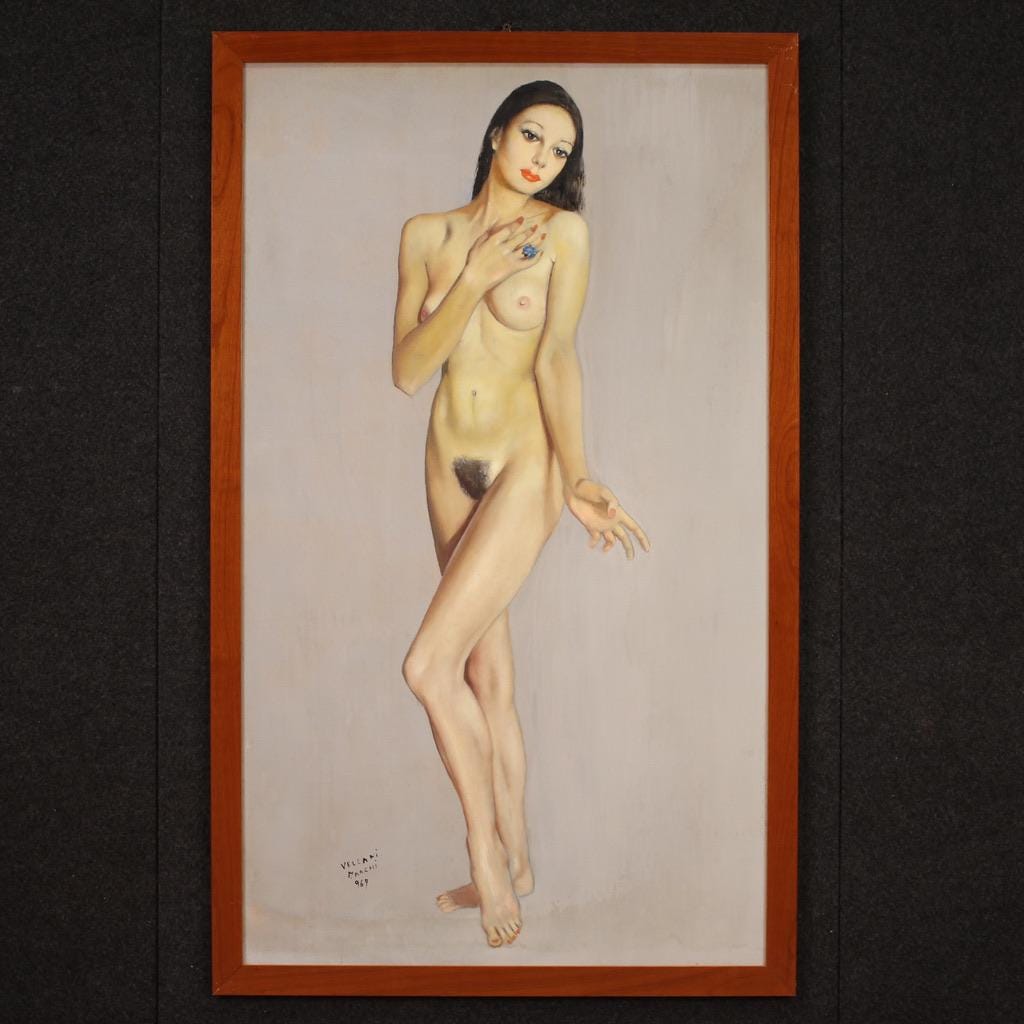 Italian painting, signed and dated 1969. Oil on masonite artwork depicting a large, attractive female nude. The painting is adorned with a simple wooden frame with some minor signs of wear (see photo).