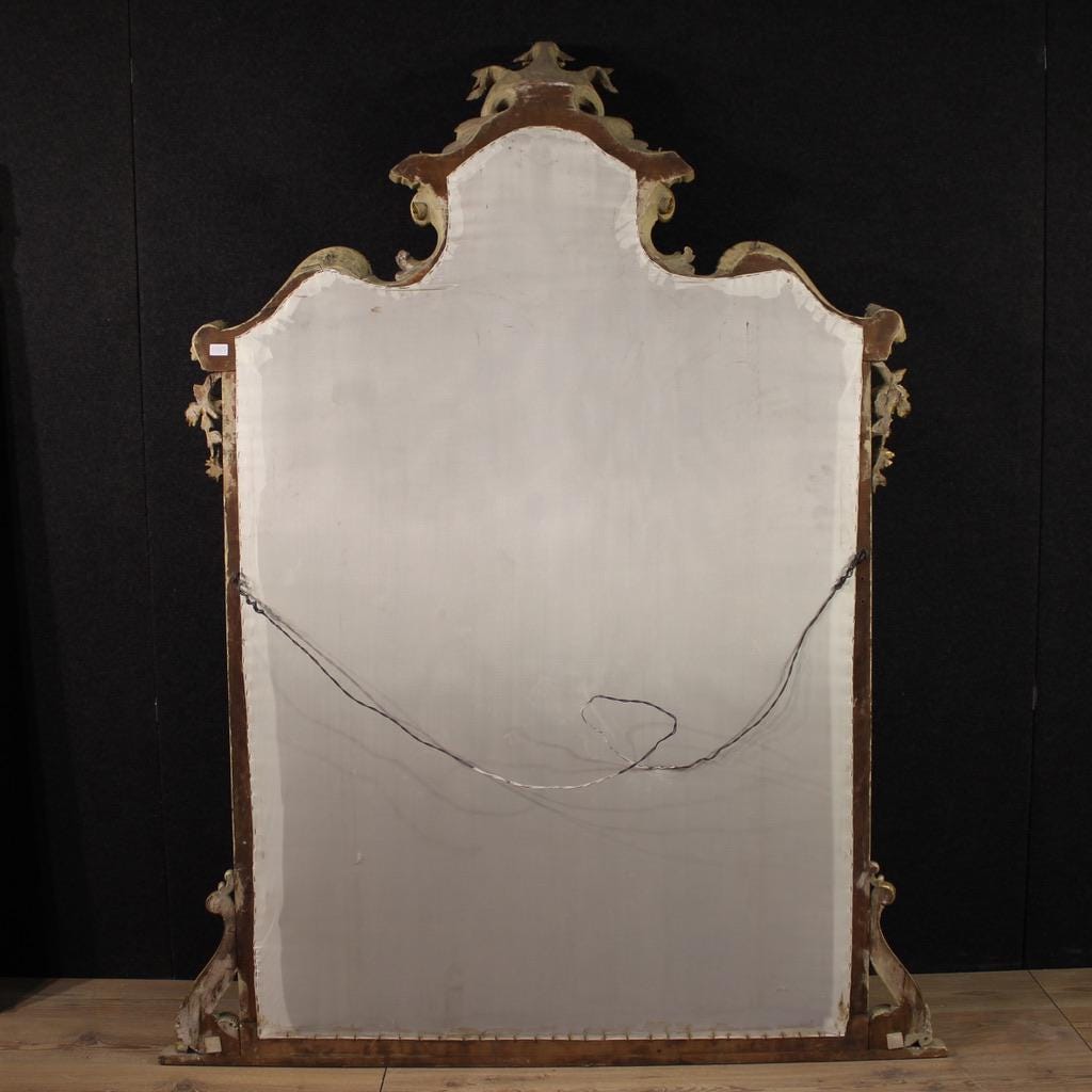 Great Italian mirror from the first half of the 20th century. A richly carved, lacquered, and gilded wooden furniture in the antique Louis XV style, of great size and quality. This pedestal mirror is ideal for placing above a fireplace or console table, and is ideal for antique dealers and interior decorators. It is embellished with gilded floral ornaments and a cornice with a large shell and flowers (see photo).