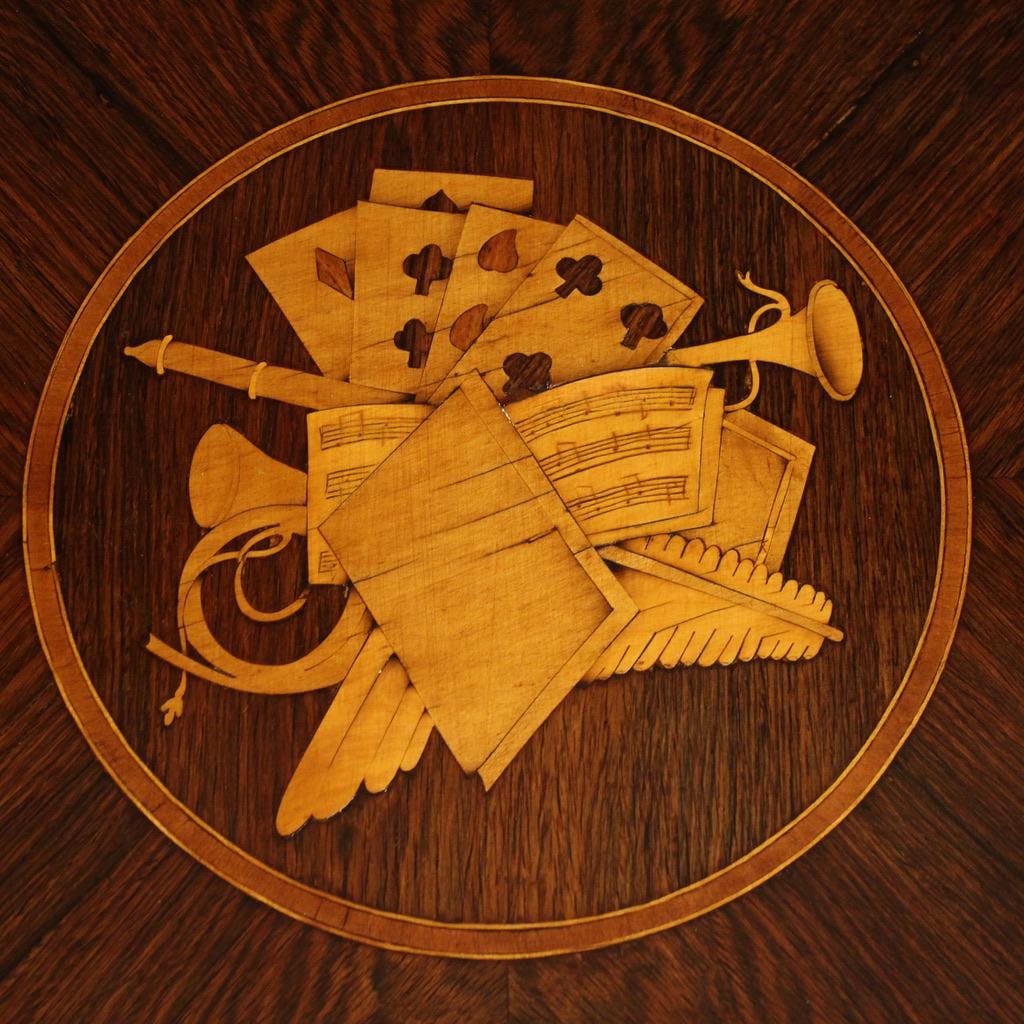The top is embellished with a central decoration featuring musical instruments and playing cards. The sides, the decoration of the two lower drawers, and the band of the top drawer are adorned with folk figures, floral ornaments, and festoons (see photo). The commode comes with three working keys, and is of good capacity and usable. It has recently undergone polishing and conservative restoration, and is structurally sound and in good condition.