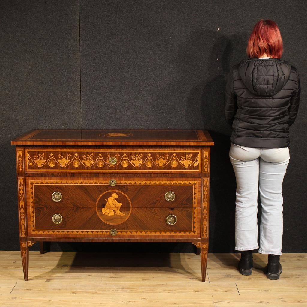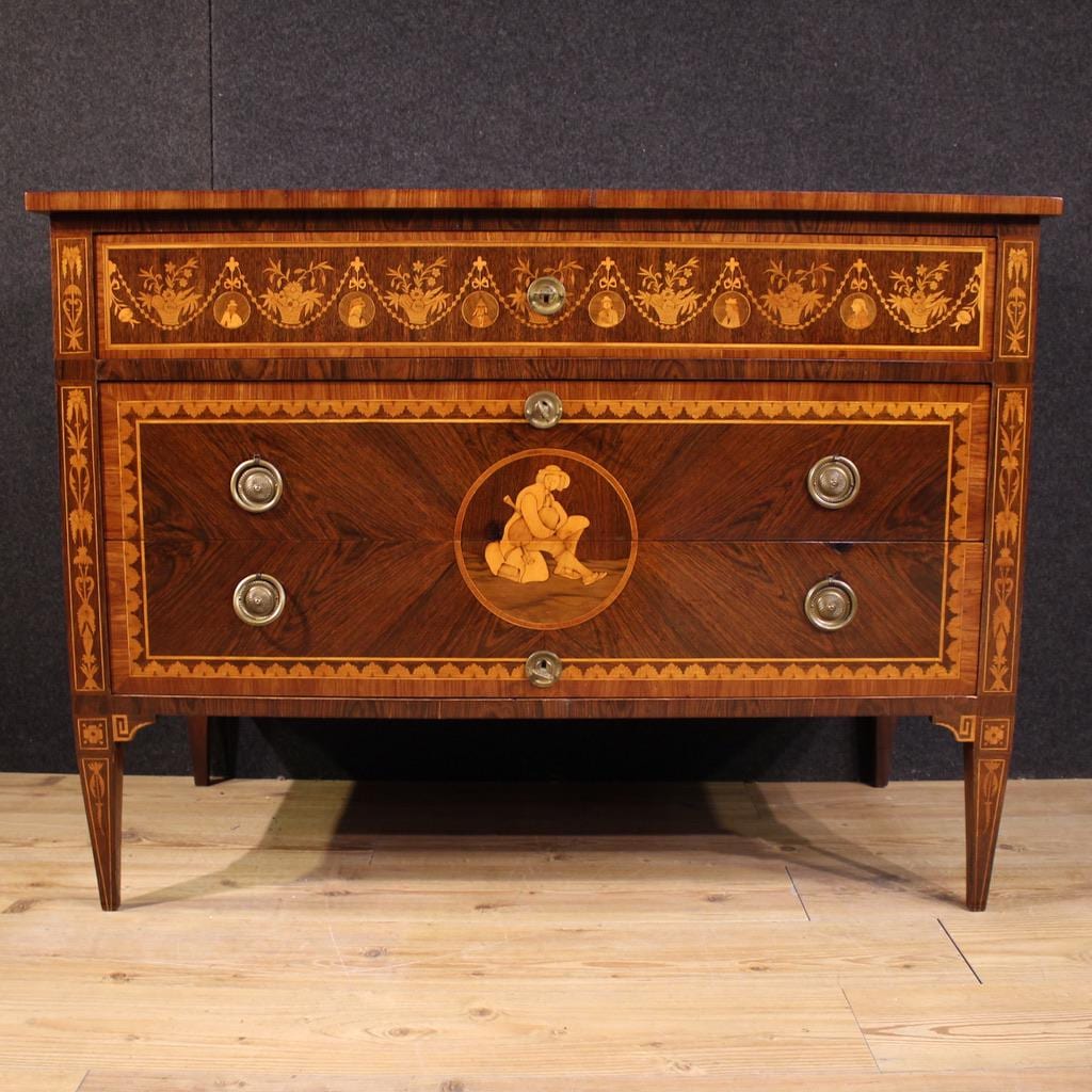 An elegant mid-20th-century Italian dresser. This Louis XVI-style furniture is richly inlaid with walnut, rosewood, maple, palisander, and fruitwood. A high-quality, beautifully sized chest of drawers, it is ideal for a living room or bedroom. It rests on four sturdy inlaid legs shaped like inverted pyramids.