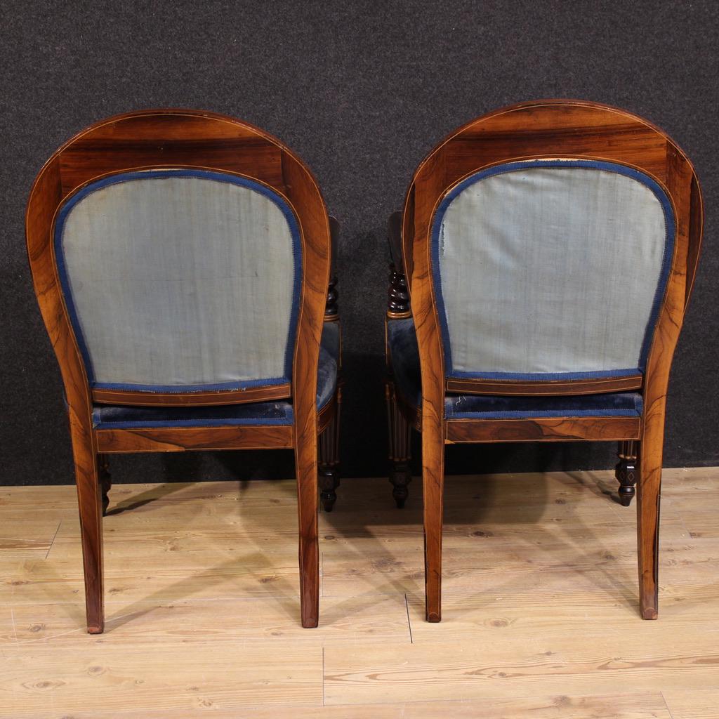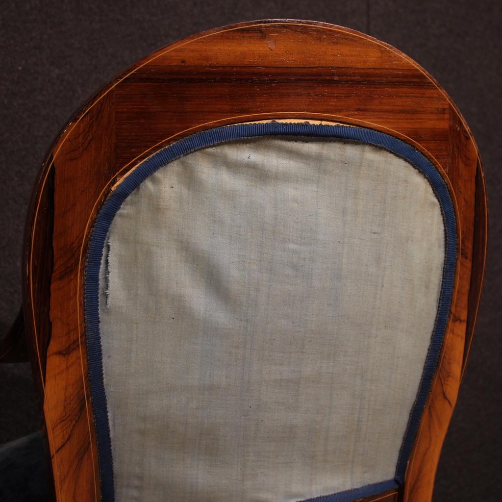 The rear legs are saber-shaped. The armrests are also exquisitely crafted, featuring two small twisted columns supporting a sculpture reminiscent of a shell (see photo). These armchairs are inlaid with precise geometric decorations and delightful floral motifs, making them truly delightful.