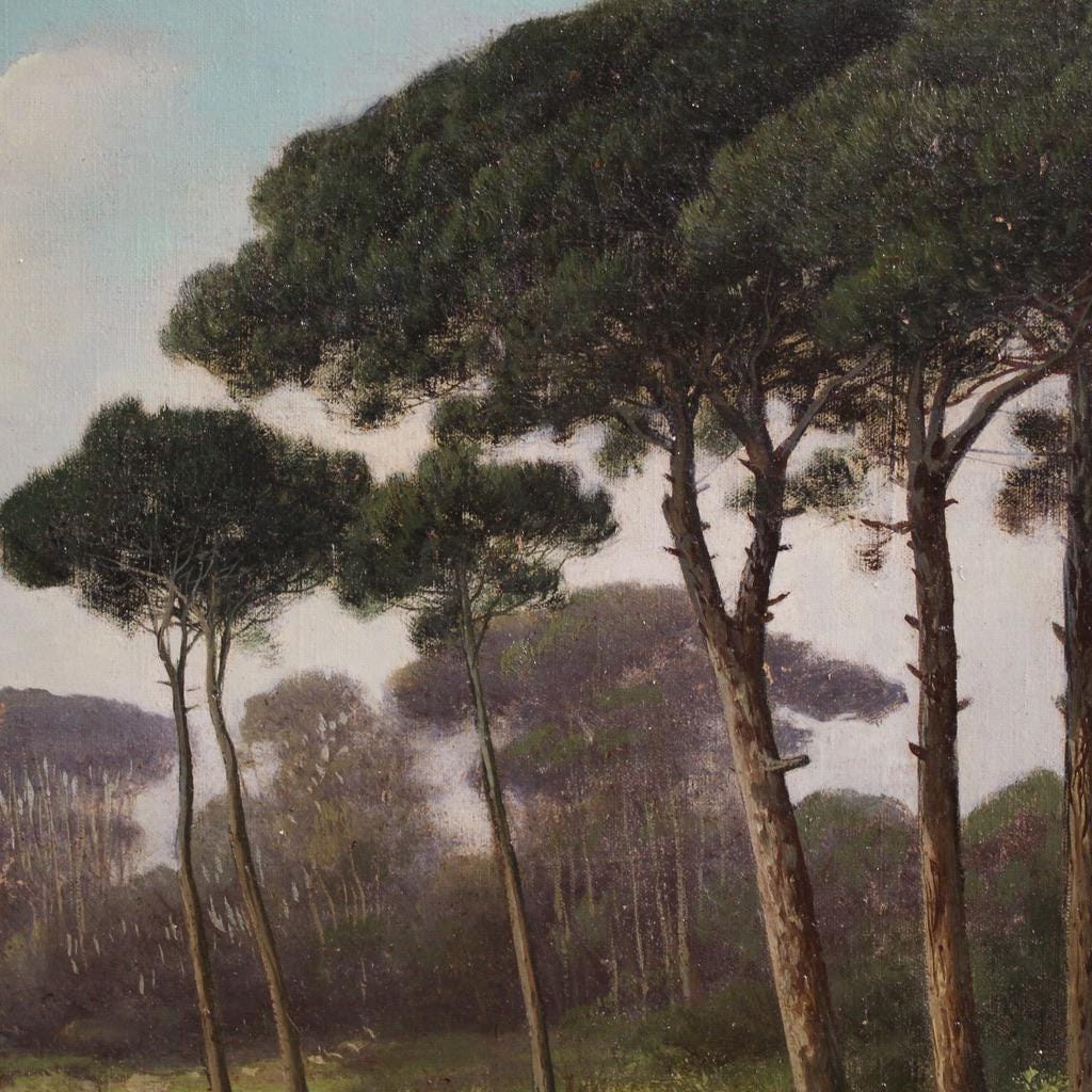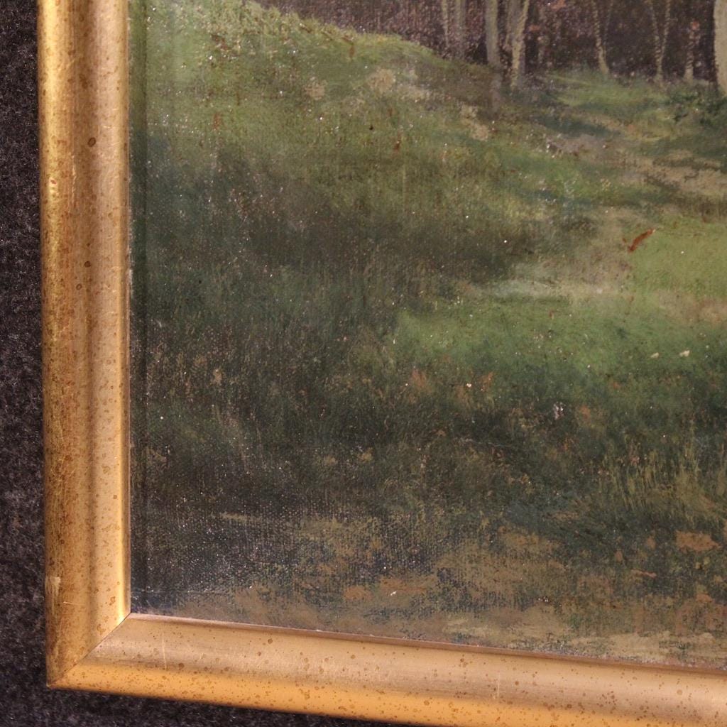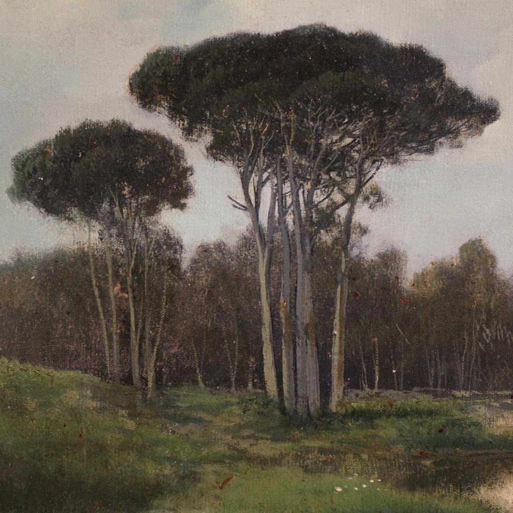 Antique Italian painting from the late 19th century. Oil on canvas, first canvas, artwork depicting a delightful landscape, a countryside view, of excellent pictorial quality. The painting is unsigned but, based on its style and execution, can be attributed to Henry Marko (1855-1921), although no authentication is available. The painting unfolds horizontally, and the artist masterfully creates excellent depth.