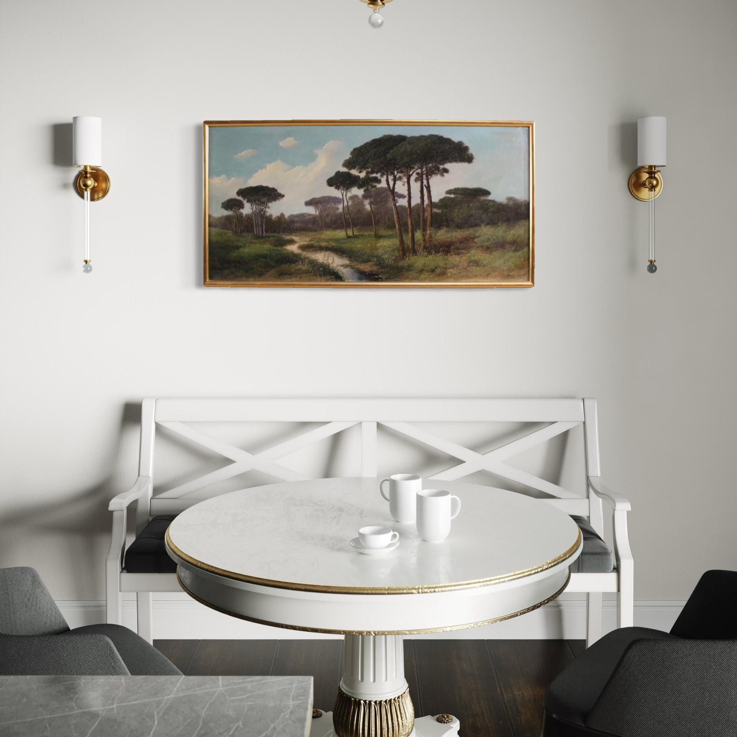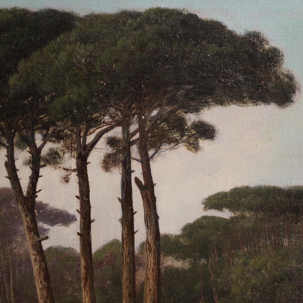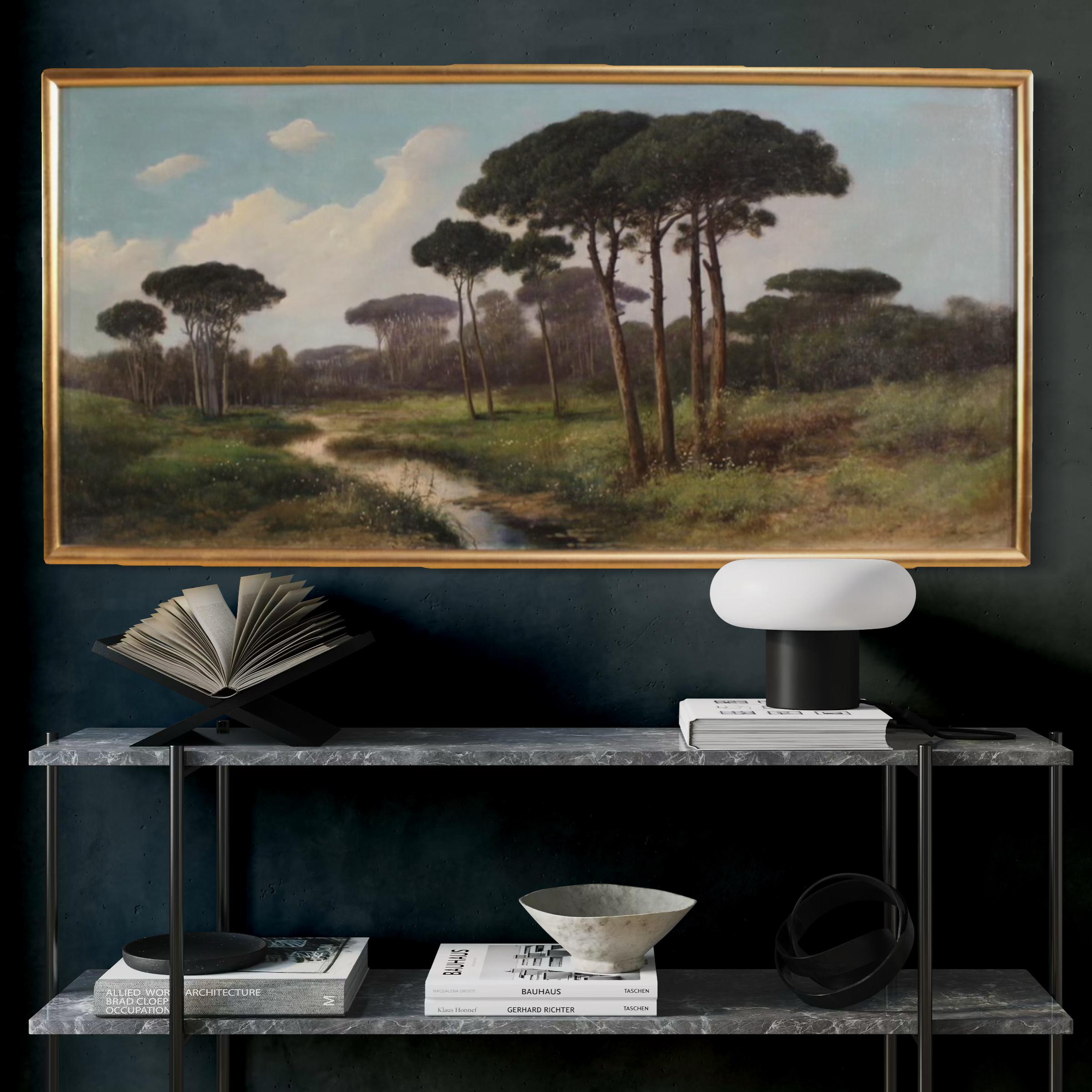 Antique Italian painting from the late 19th century. Oil on canvas, first canvas, artwork depicting a delightful landscape, a countryside view, of excellent pictorial quality. The painting is unsigned but, based on its style and execution, can be attributed to Henry Marko (1855-1921), although no authentication is available. The painting unfolds horizontally, and the artist masterfully creates excellent depth.