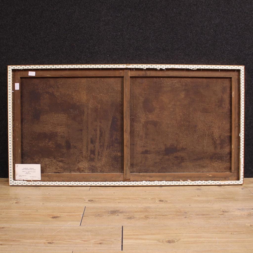 A highly refined painting, for antique dealers, interior decorators, and collectors of Italian views. Adorned with a beautiful, non-contemporary, carved and gilded wooden frame, it is attractively decorated. This well-proportioned artwork can easily be placed in various areas of the home, from the hallway to the living room. The painting has undergone cleaning and conservative restoration, and is now in good condition. Internal dimensions: H 57 x W 116.5 cm.