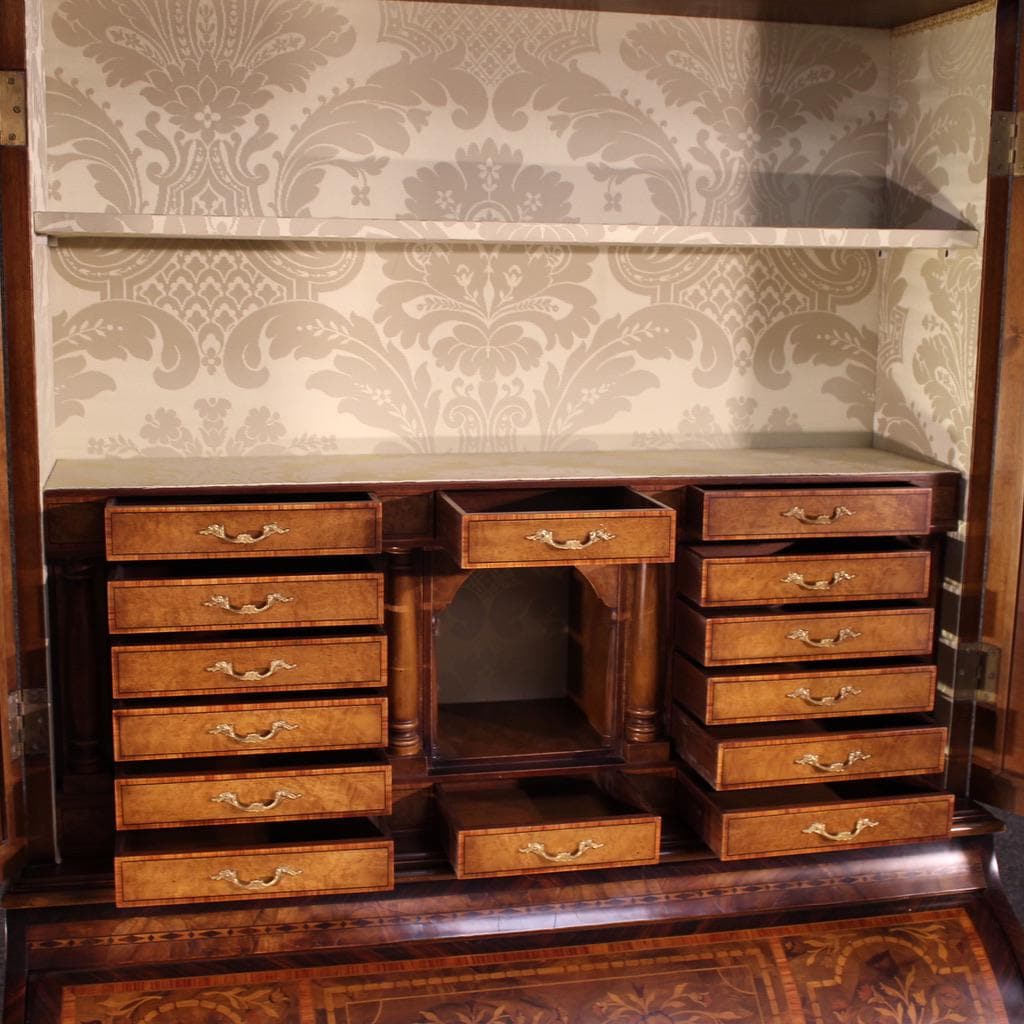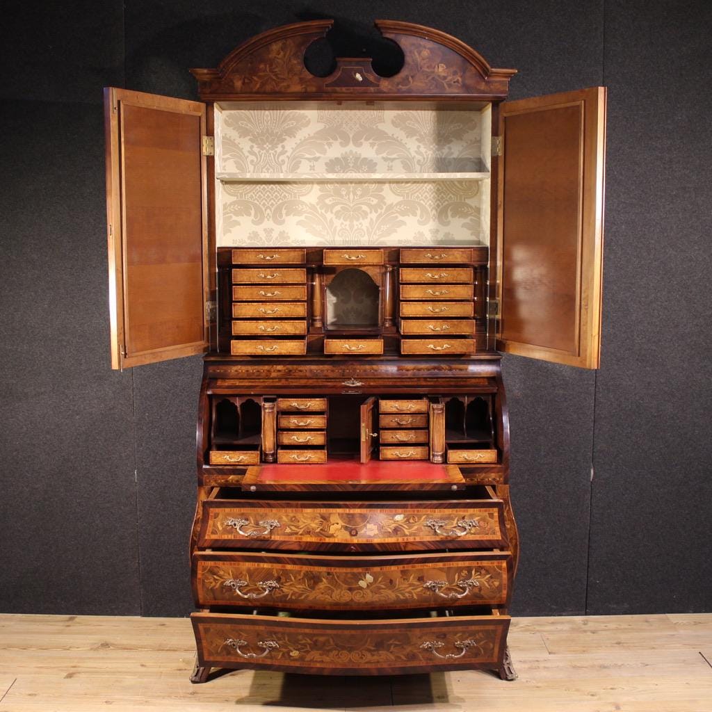 Dutch trumeau from the second half of the 20th century. A curved front and straight sides of excellent quality, richly inlaid with walnut, burl, rosewood, maple, mahogany, and fruitwood, decorated with floral and butterfly motifs. This double-body trumeau features three spacious drawers in the lower section, a pull-out writing surface, and numerous small drawers and document compartments within the roller shutter (see photo).