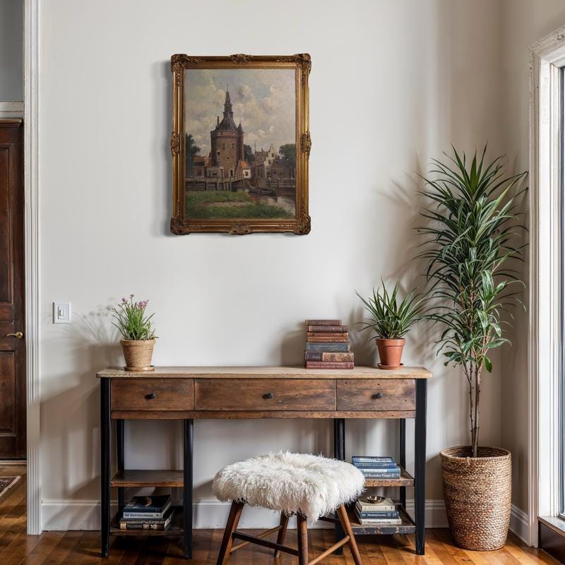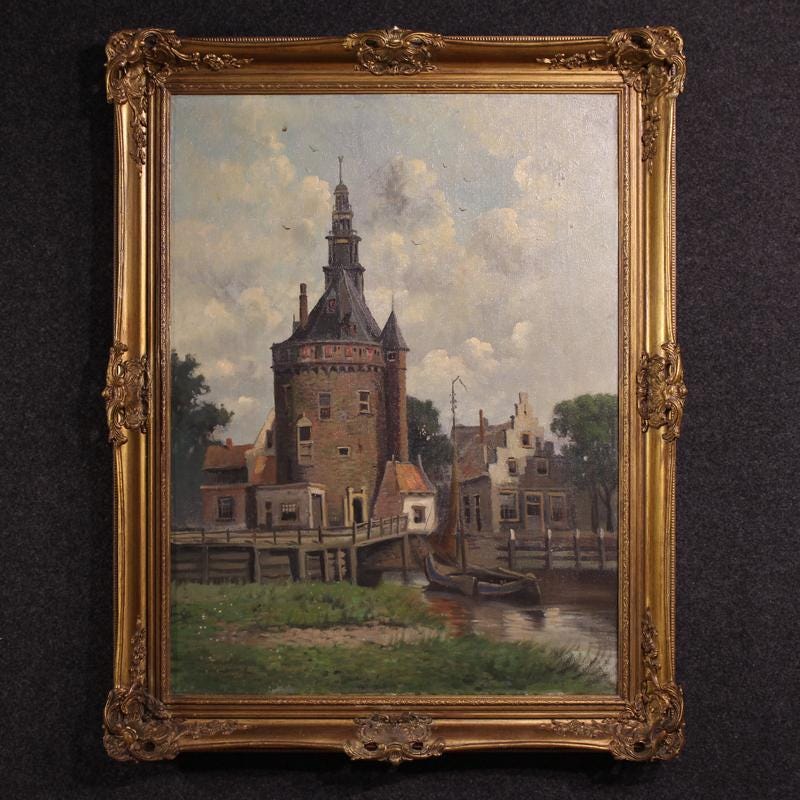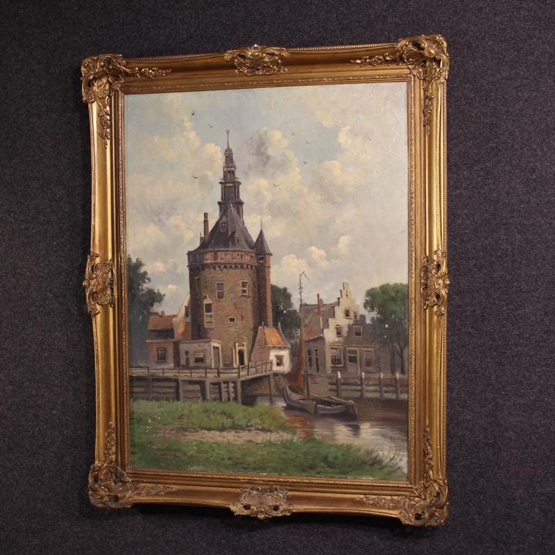 Dutch painting from the mid-20th century. Oil on canvas, first canvas, painting depicting a view of the city of Hoorn, detailing the defensive structure known as the Hoofdtoren. The painting is adorned with a beautifully decorated wood and plaster frame, carved and gilded (bronze tint).