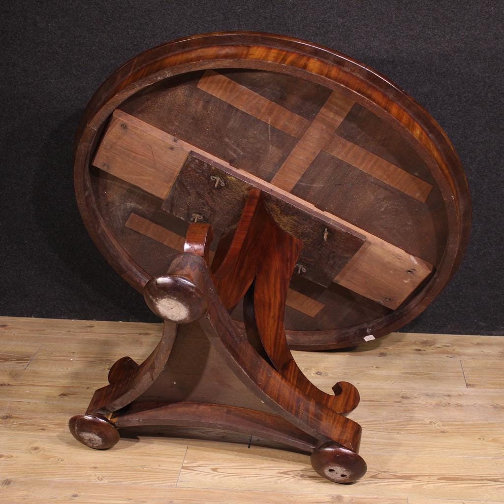 A pleasantly furnished table, ideal for a living room or dining room, for antique dealers and interior decorators. Structurally sound and solid, it shows some signs of wear and small missing veneers. Overall, in fair condition. Requires restoration.