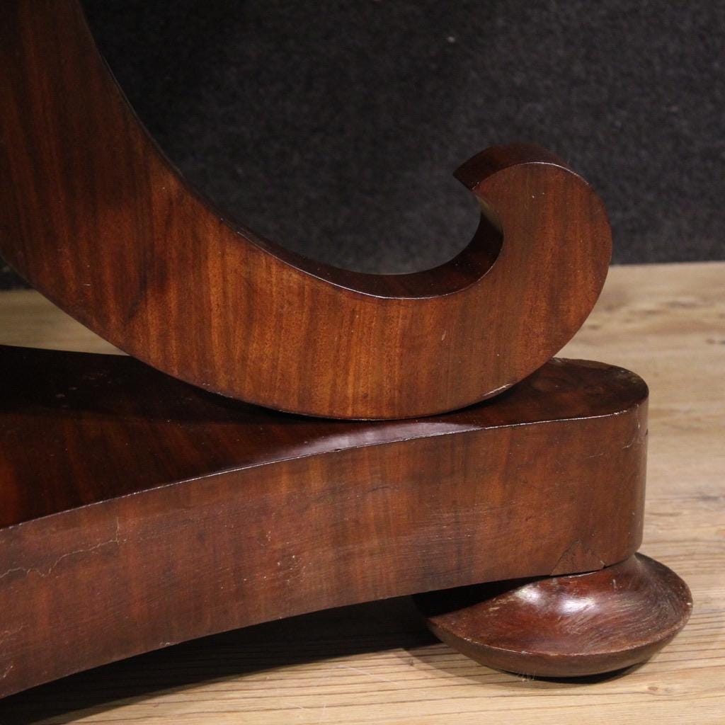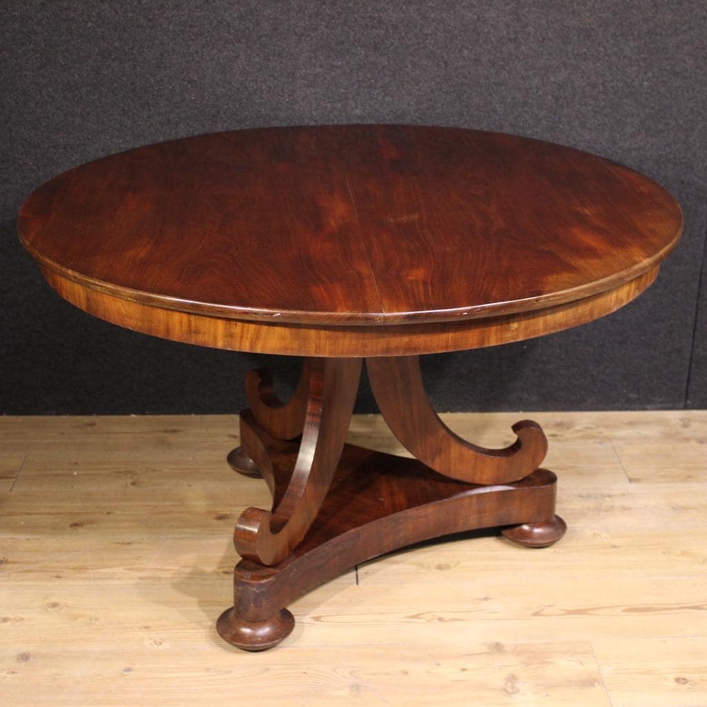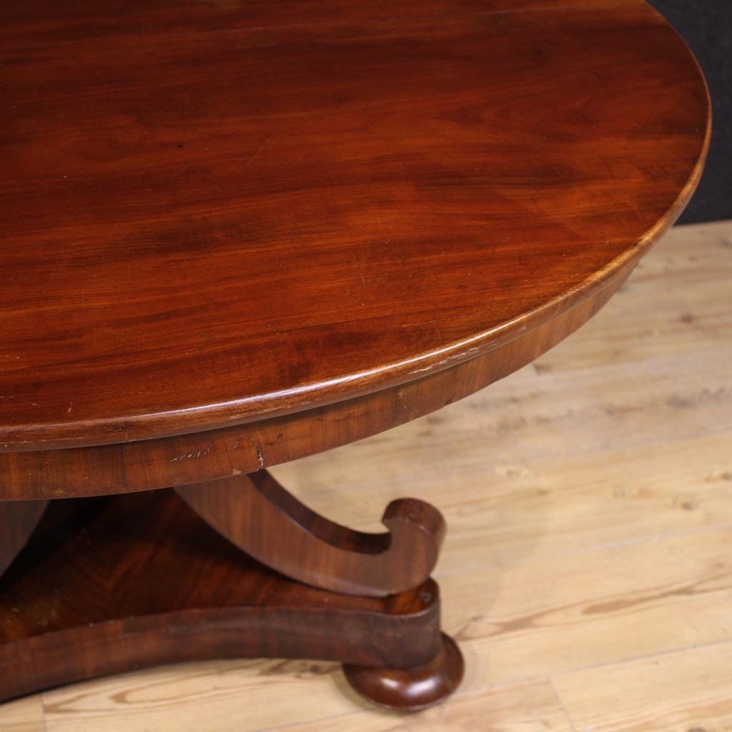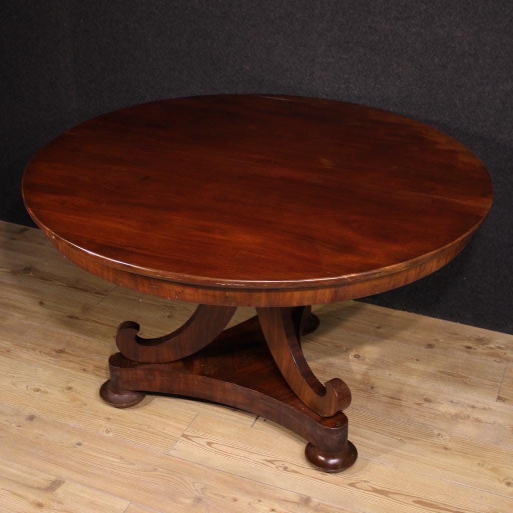 Dutch table from the late 19th century. Carved and veneered in high-quality mahogany. A round table of excellent size and service, it can also be used as a dining table, comfortably seating four people. The table features a triangular base resting on three wooden legs and connected to the top by an elegant central body.