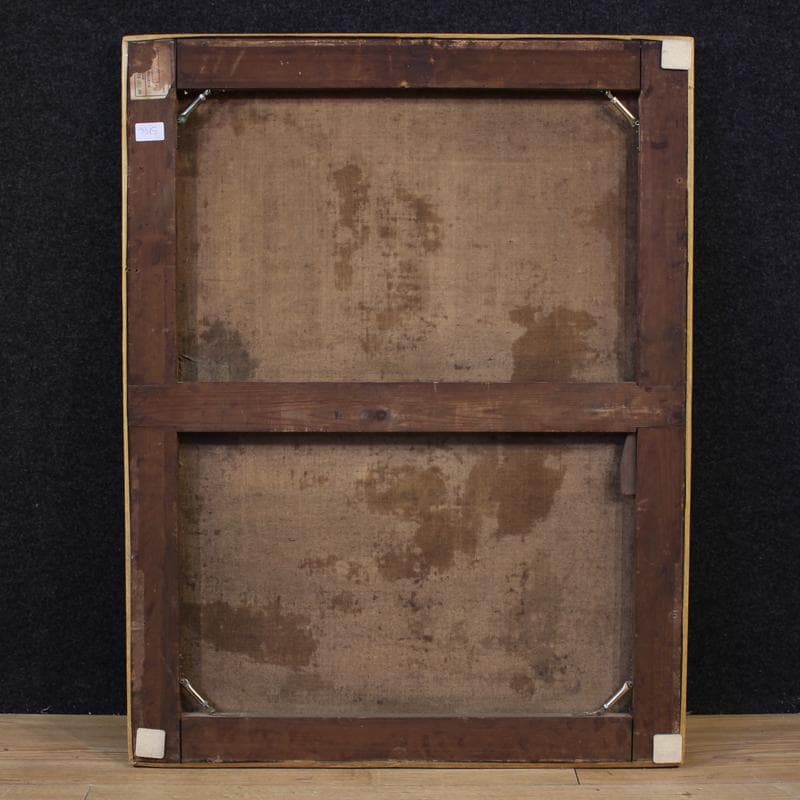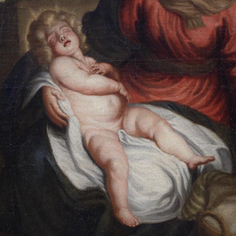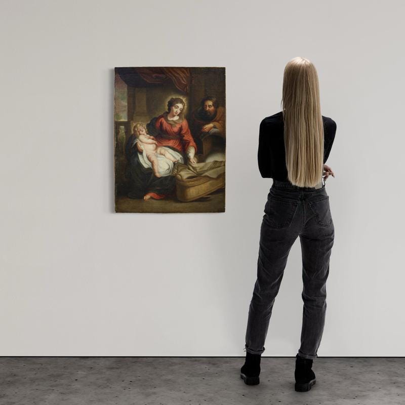 In her arms, a curly-haired baby Jesus sleeps blissfully, about to be placed in the cradle. To the right, Joseph observes the scene. The painting has undergone conservative restoration, relining, and recoloring in several areas (see photo). Overall, the painting is in good condition.