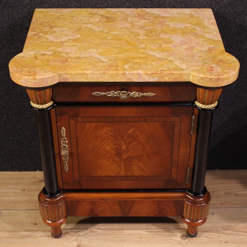 Pair of Italian bedside tables from the second half of the 20th century. Veneered and inlaid furniture in mahogany, walnut, ebonized wood, and fruitwood, these beautifully designed and attractively furnished bedside tables feature ebonized side columns and a door and drawer each, offering a good capacity. The original marble top (glued to the wooden frame, not separable) is a good size and serviceable.