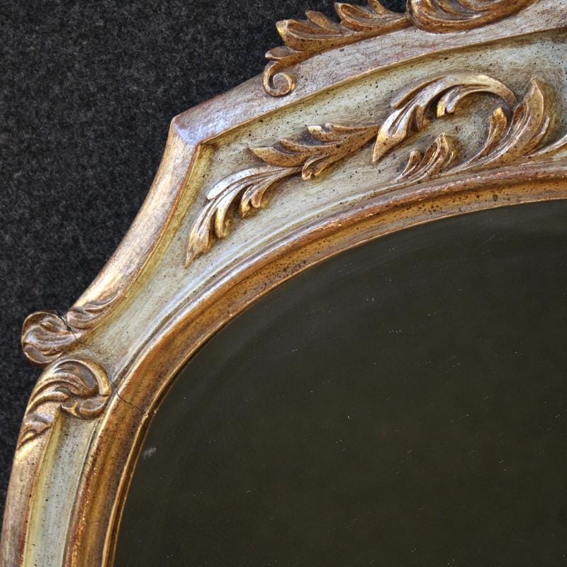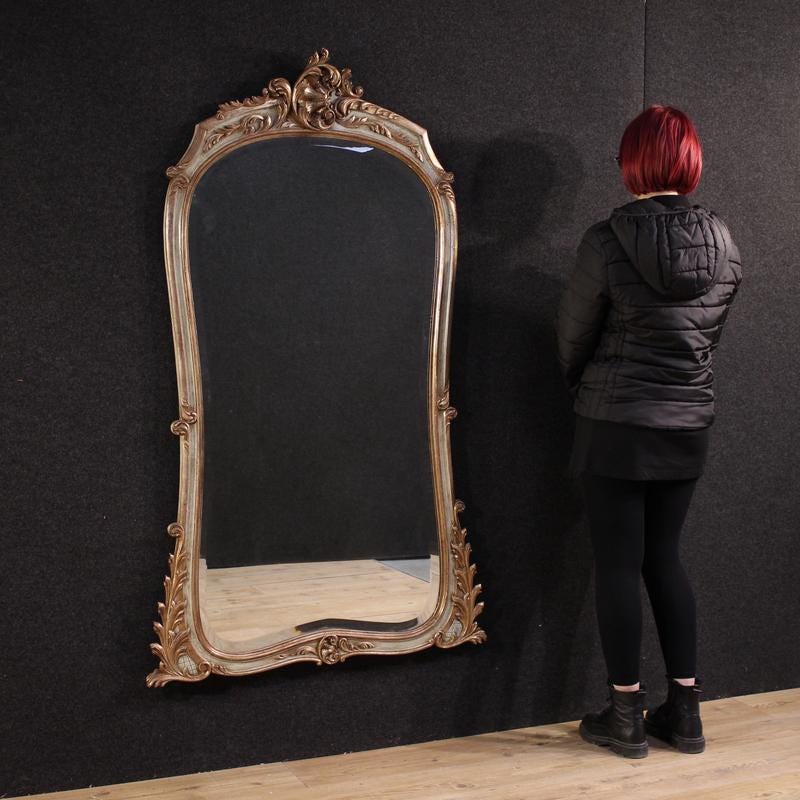 Mid-20th-century French mirror. This Louis XV-style piece of furniture is in carved, lacquered, and silvered wood features beautiful lines and a pleasing décor. This pedestal mirror is ideal for placing above a console table, fireplace, or chest of drawers, but can also be used freestanding without a stand. The mirror comes complete with a perfectly reflective beveled mirror (see photo). This vertically oriented mirror is highly elegant and very useful. In good condition.