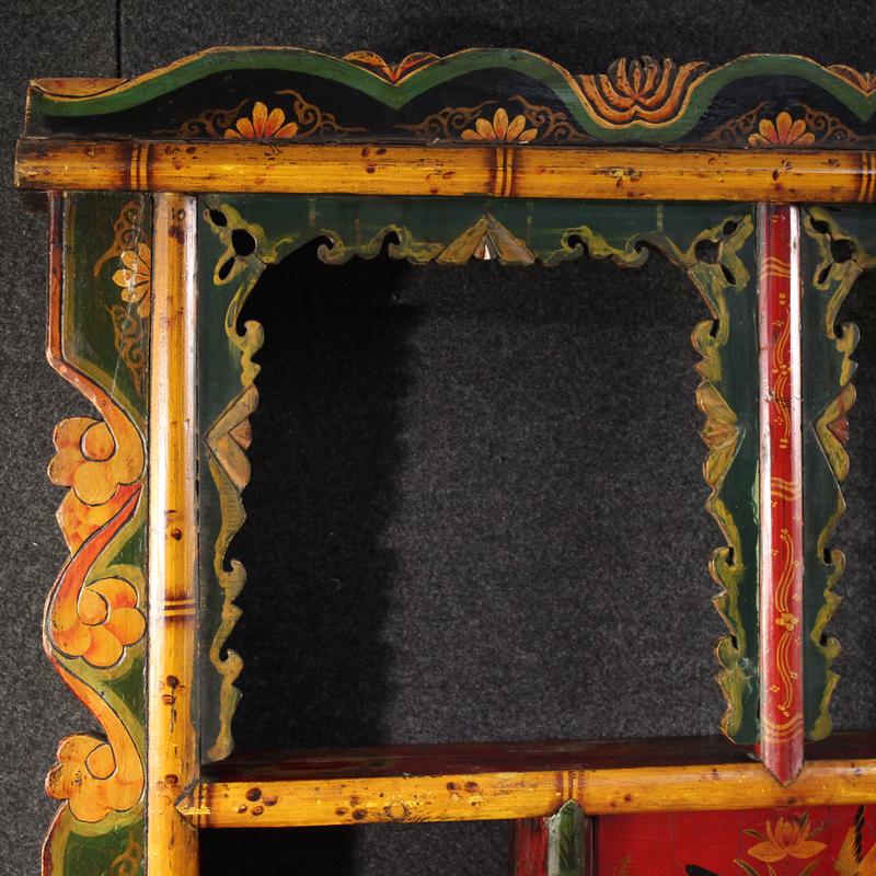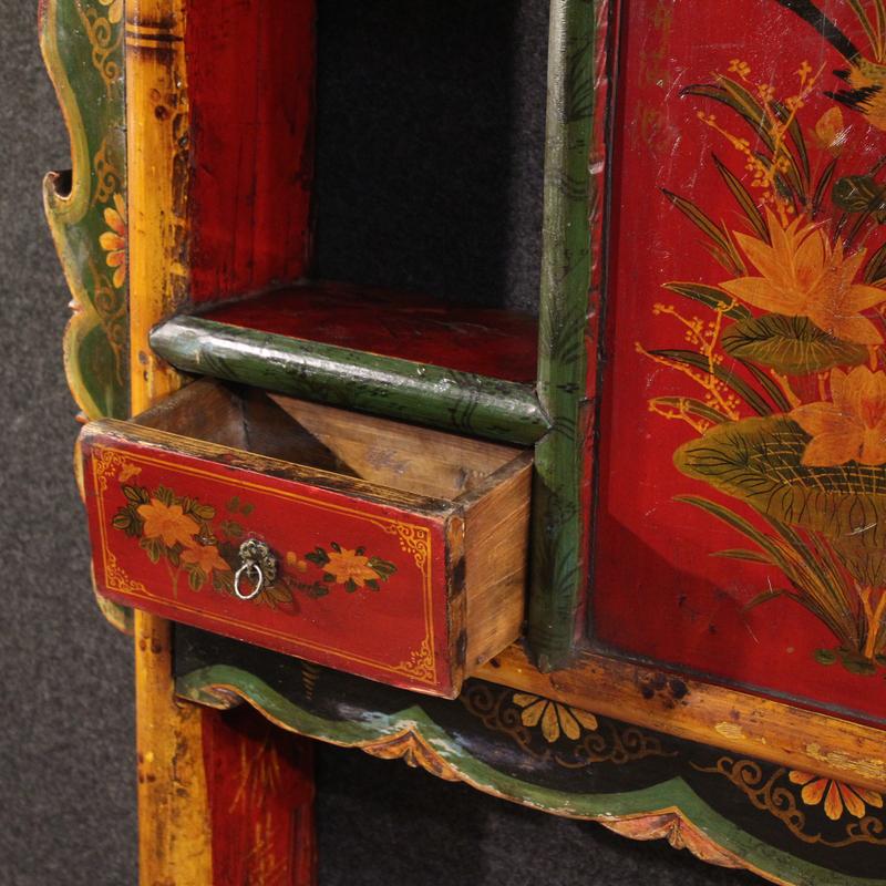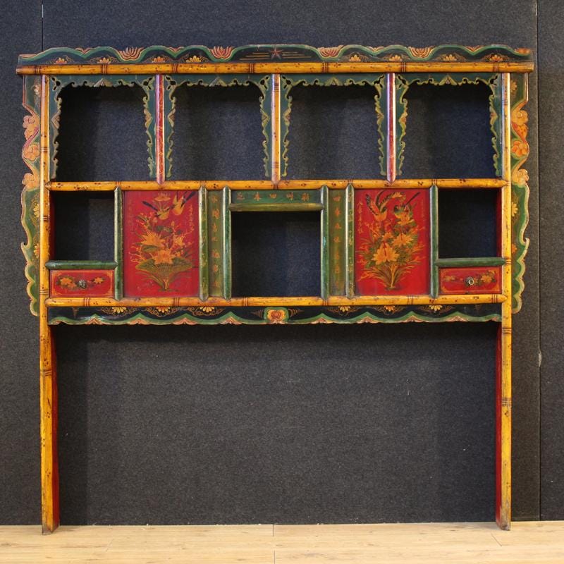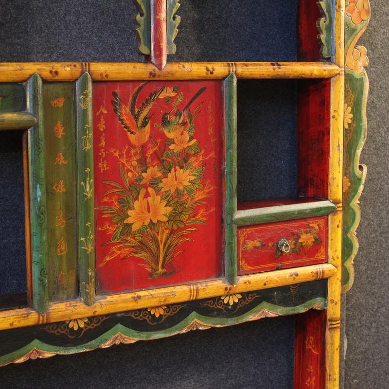 A 20th-century Chinese headboard. This piece of furniture is carved, lacquered, and hand-painted with exquisite floral decorations. This large, impactful wall-mounted piece is ideal as a headboard, but it can also be placed in a living room as a decorative piece for a sofa or a piece of furniture, fitting into the lower compartment, measuring H 79 x W 166 cm.